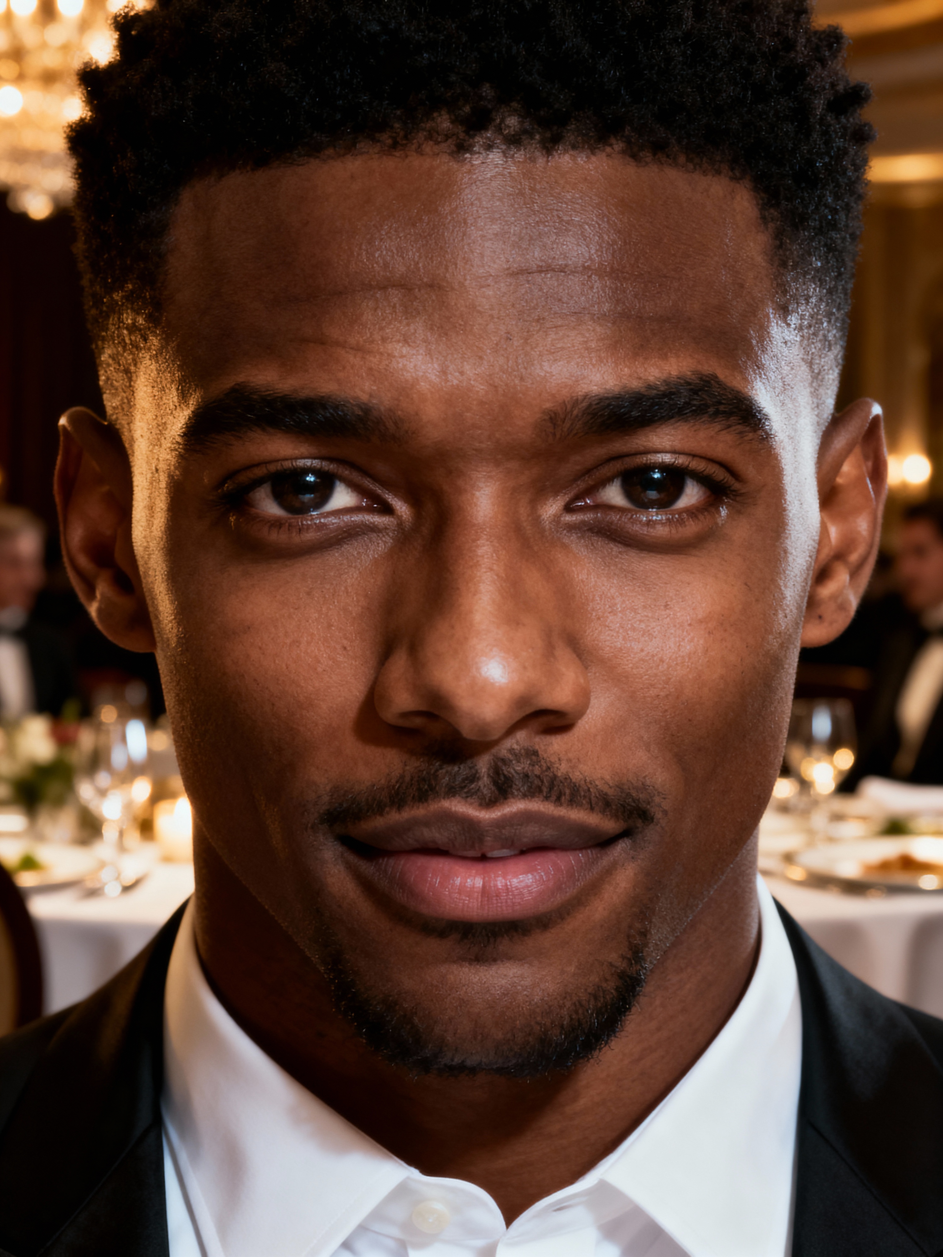 Full-body front view shot of model enjoying a luxury gala dinner, dressed as a formal dinner jacket with a crisp white shirt. High end luxury restaurant.