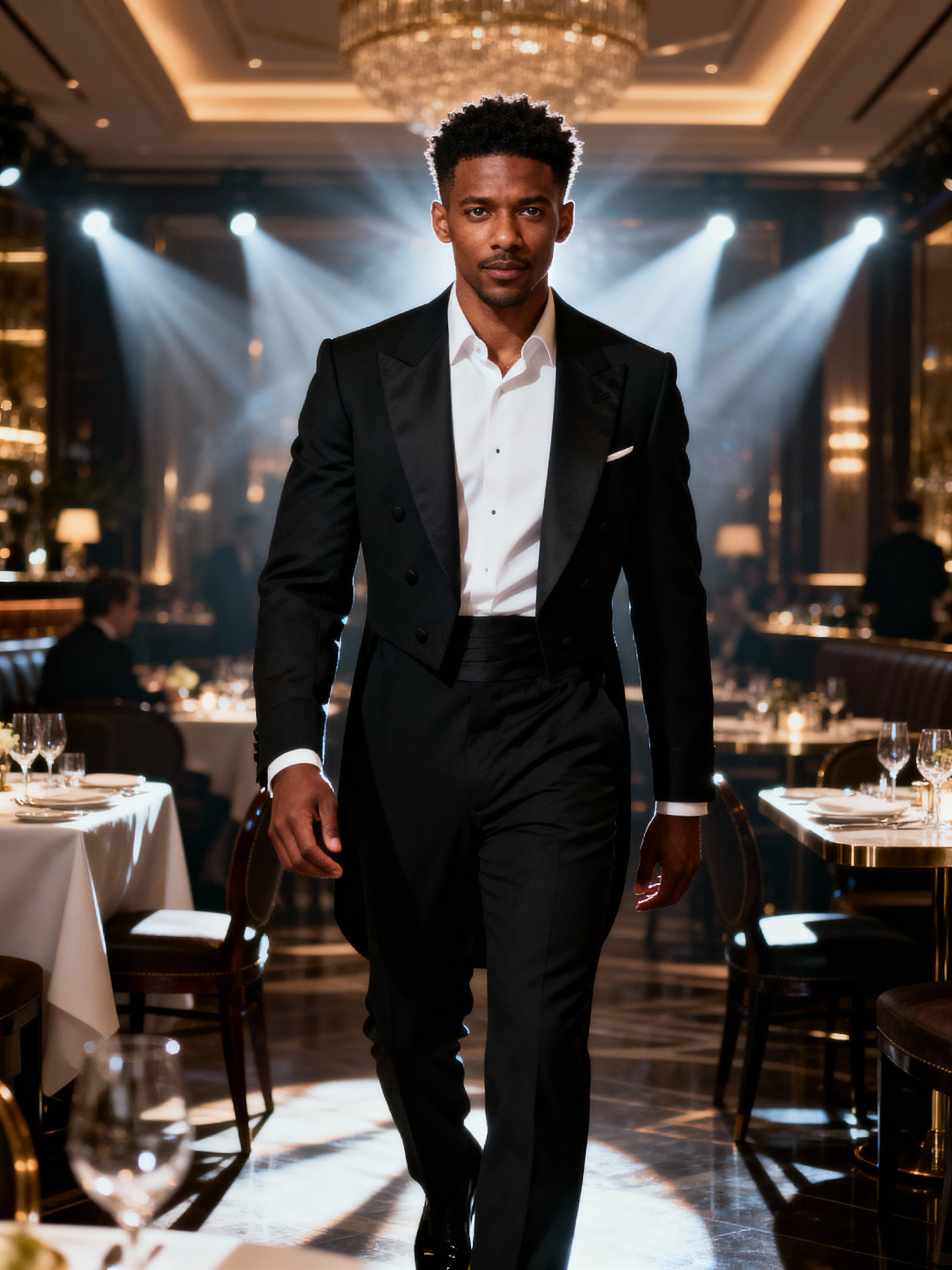 Full-body front view shot of model enjoying a luxury gala dinner, dressed as a formal dinner jacket with a crisp white shirt. High end luxury restaurant.