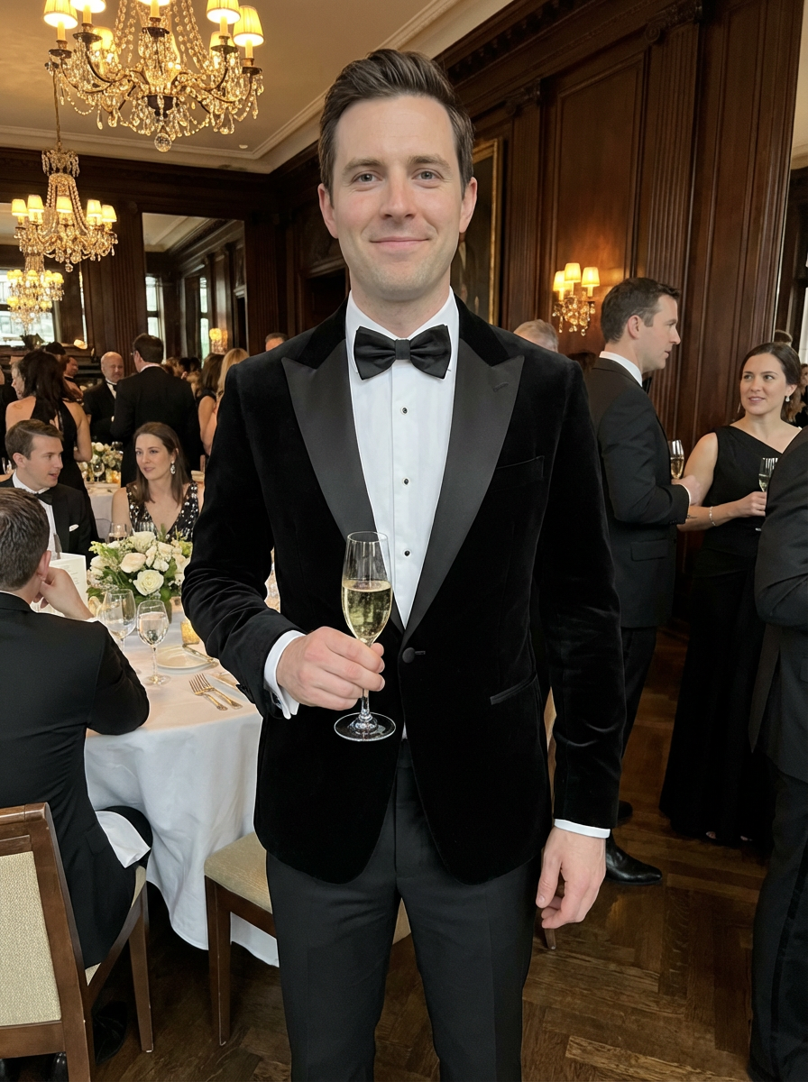 Full-body front view shot of model enjoying a luxury gala dinner, dressed as a formal dinner jacket with a crisp white shirt. High end luxury restaurant.