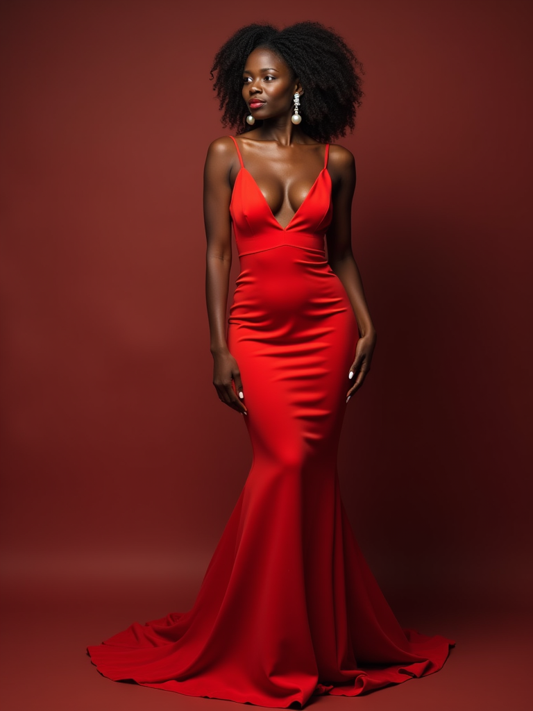 Full-body front view shot of model enjoying a luxury gala dinner, dressed as a chic red fitted evening dress with pearl earrings . High end luxury restaurant.