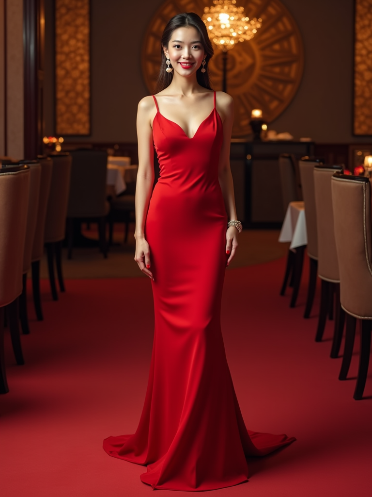 Full-body front view shot of model enjoying a luxury gala dinner, dressed as a chic red fitted evening dress with pearl earrings . High end luxury restaurant.