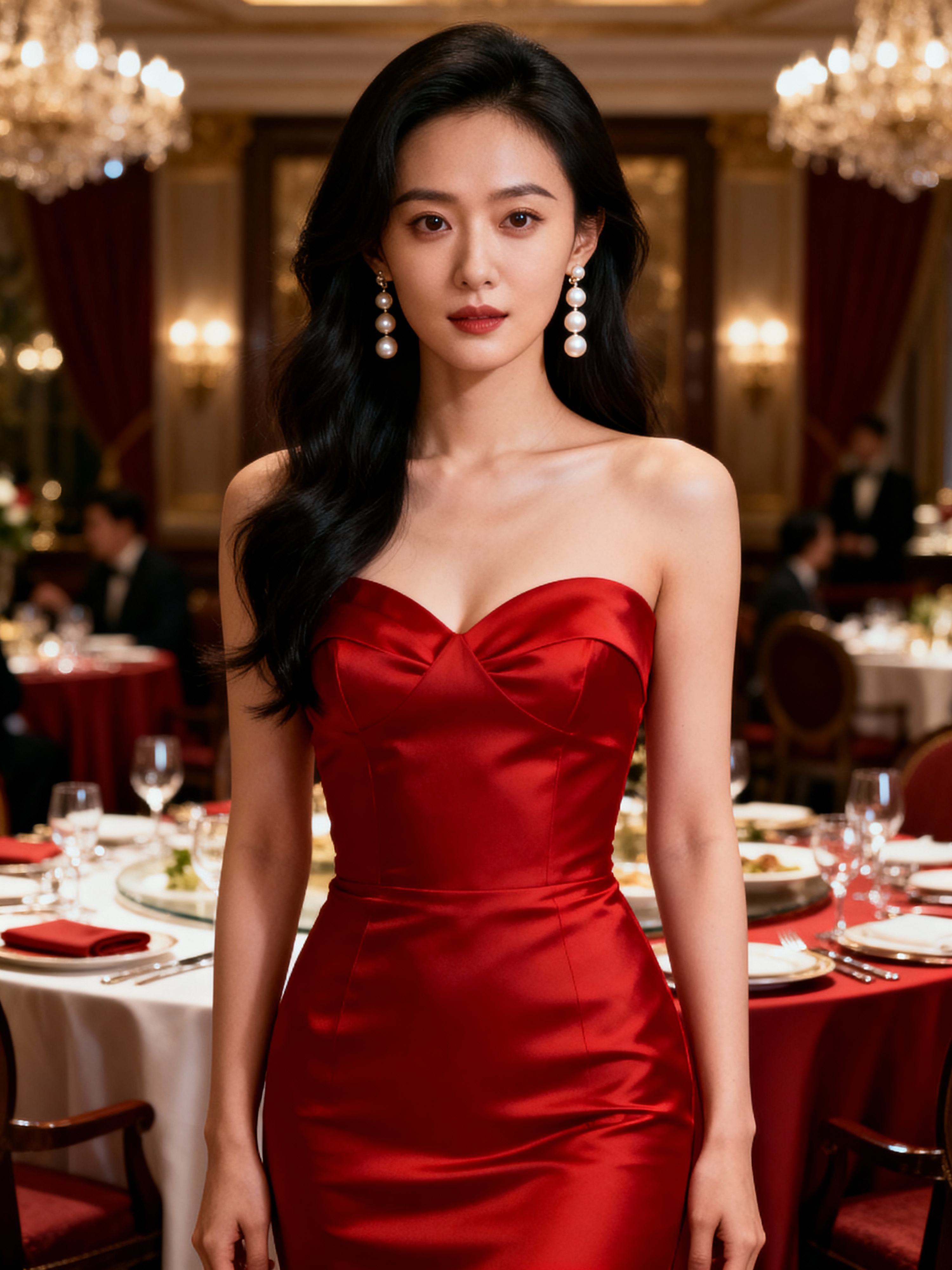 Full-body front view shot of model enjoying a luxury gala dinner, dressed as a chic red fitted evening dress with pearl earrings . High end luxury restaurant.