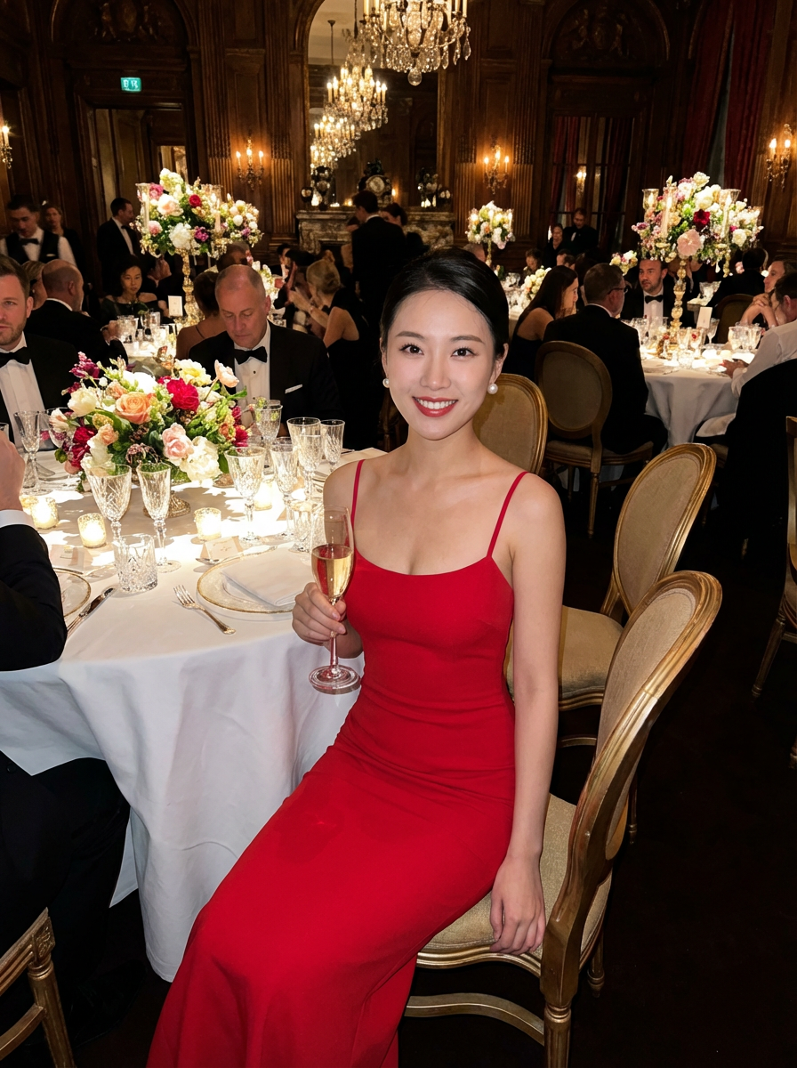Full-body front view shot of model enjoying a luxury gala dinner, dressed as a chic red fitted evening dress with pearl earrings . High end luxury restaurant.