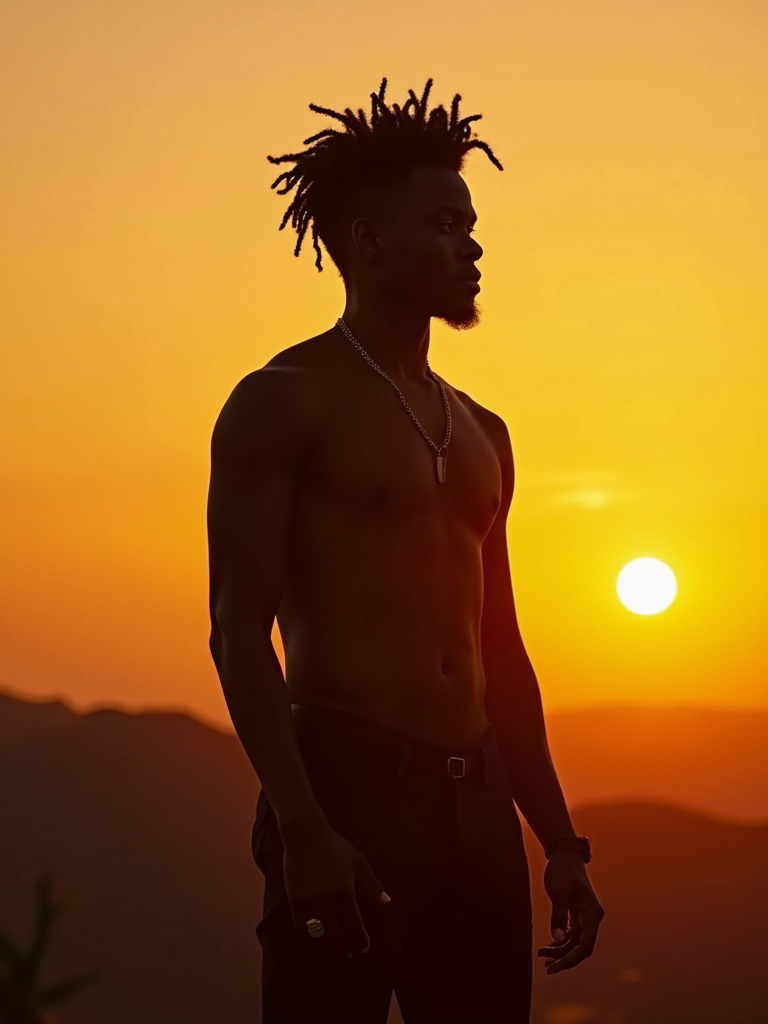 Full body golden hour candid of model. Complete candid moment in sunset. Golden hour documentary style.