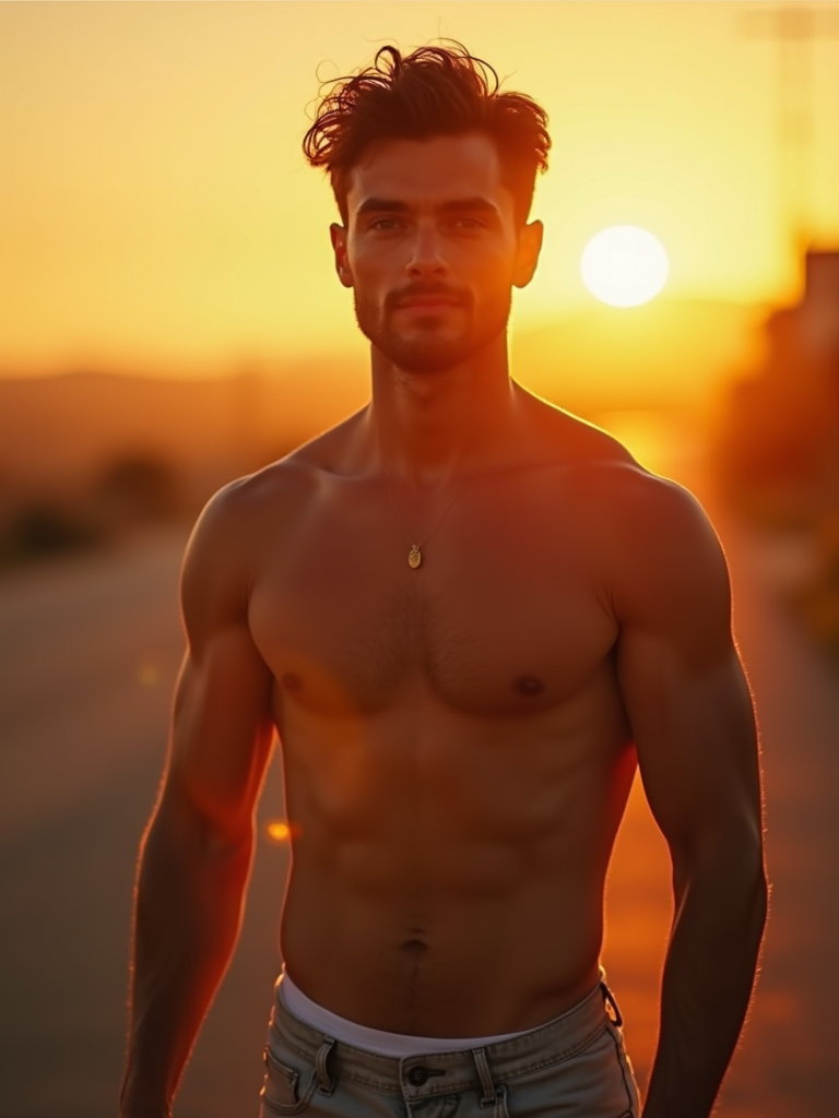 Full body golden hour candid of model. Complete candid moment in sunset. Golden hour documentary style.