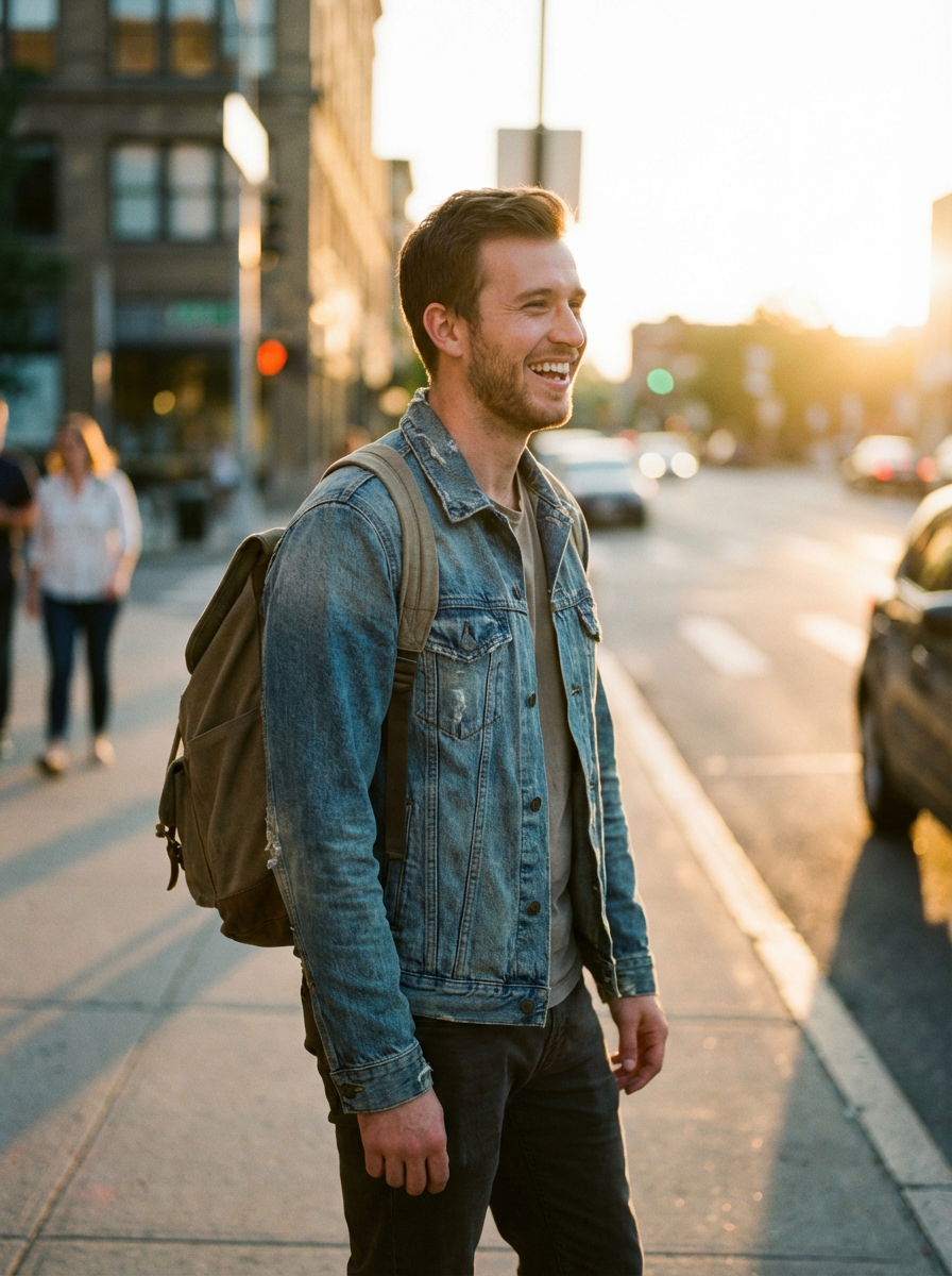 Full body golden hour candid of model. Complete candid moment in sunset. Golden hour documentary style.
