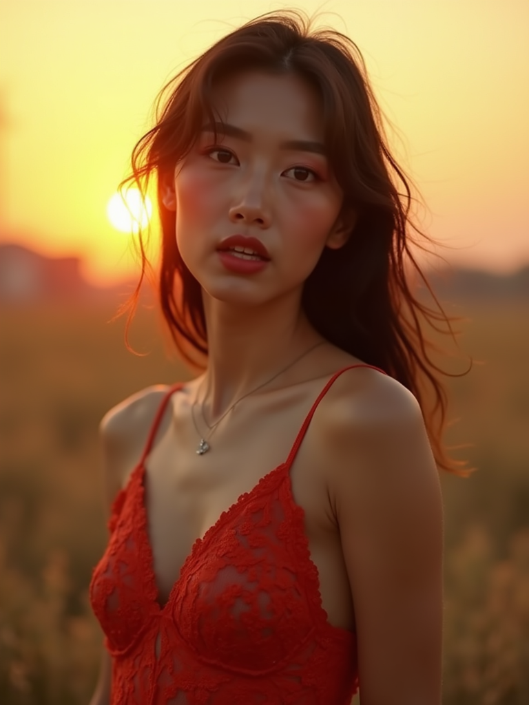 Full body golden hour candid of model. Alluring full body pose in warm light . Golden hour documentary style.