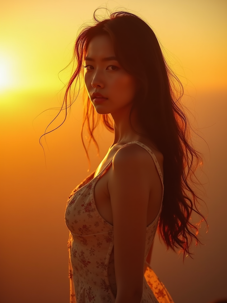 Full body golden hour candid of model. Alluring full body pose in warm light . Golden hour documentary style.