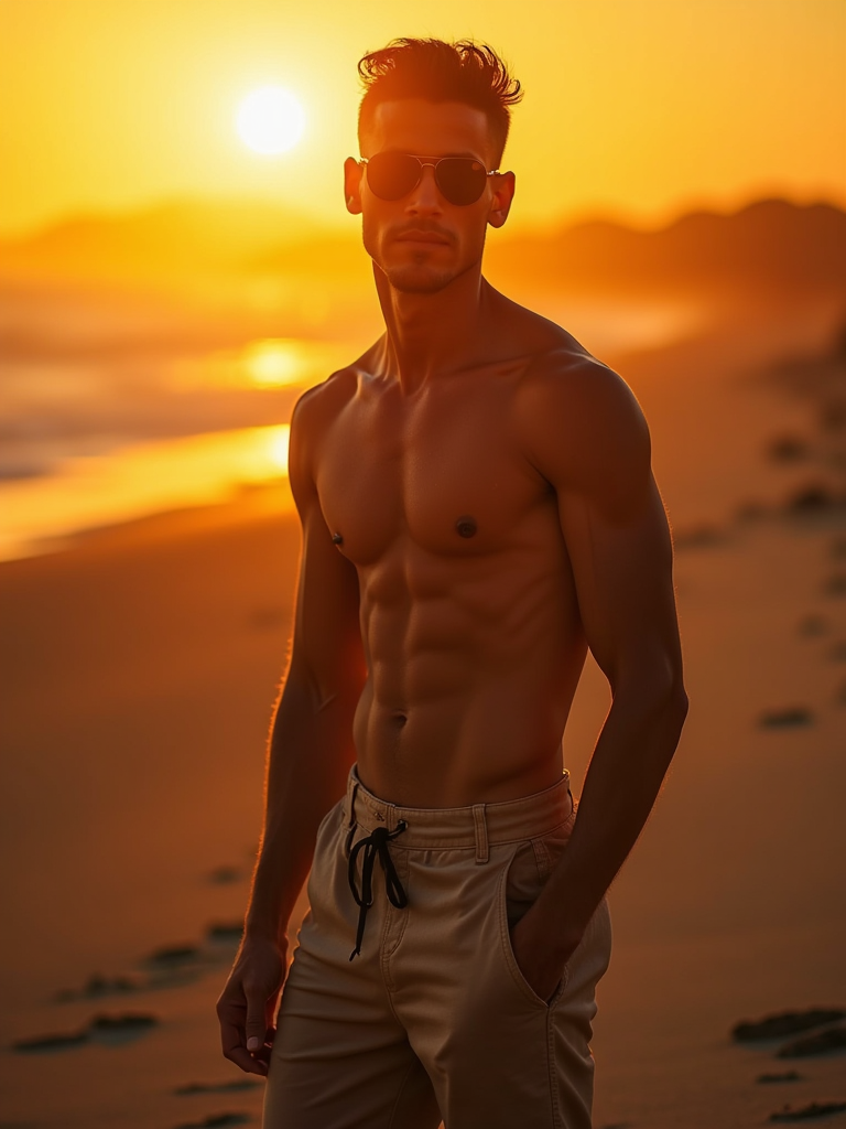 Full body golden hour portrait of model. Complete look in sunset glow. Golden hour photography.
