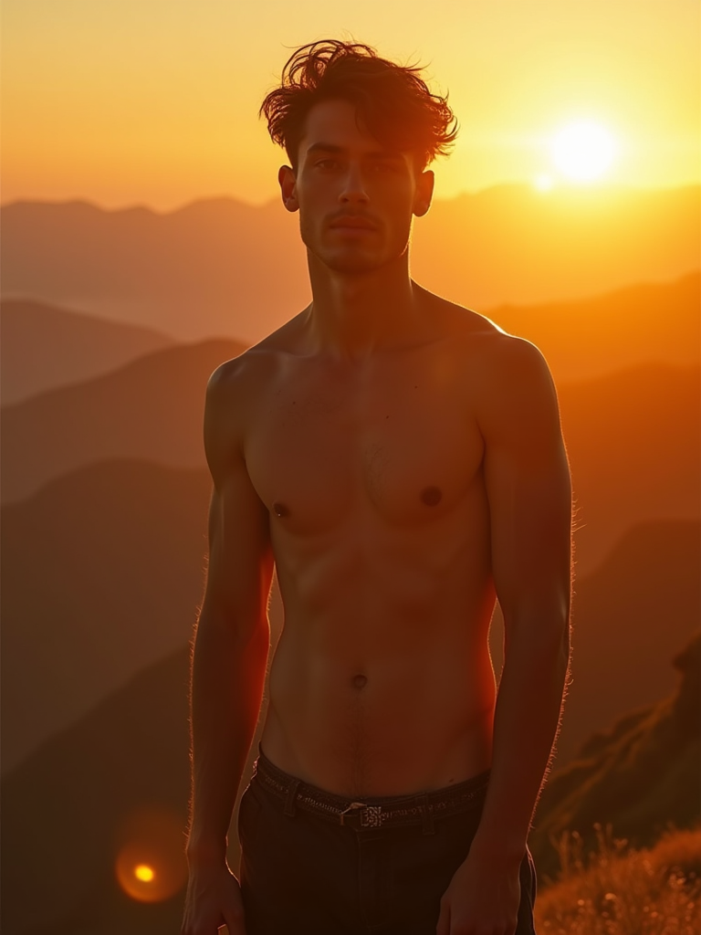 Full body golden hour portrait of model. Complete look in sunset glow. Golden hour photography.