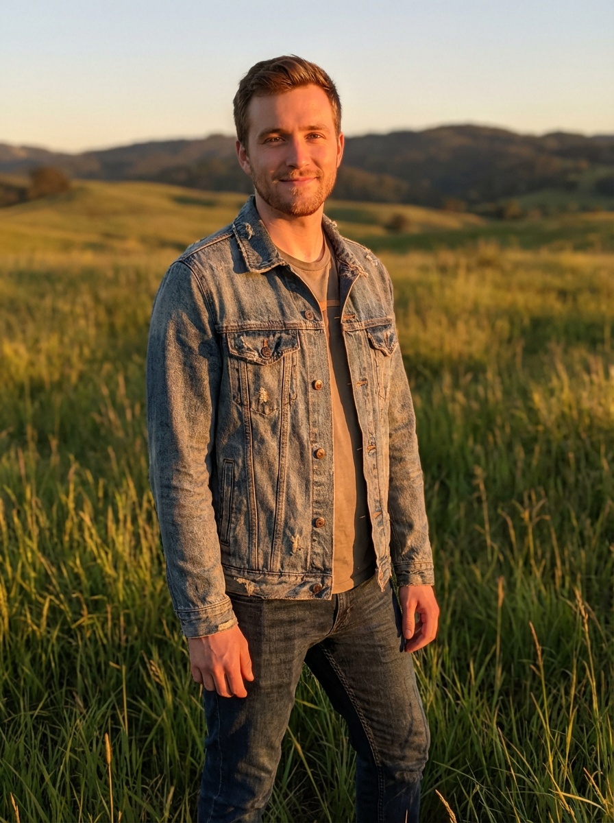 Full body golden hour portrait of model. Complete look in sunset glow. Golden hour photography.