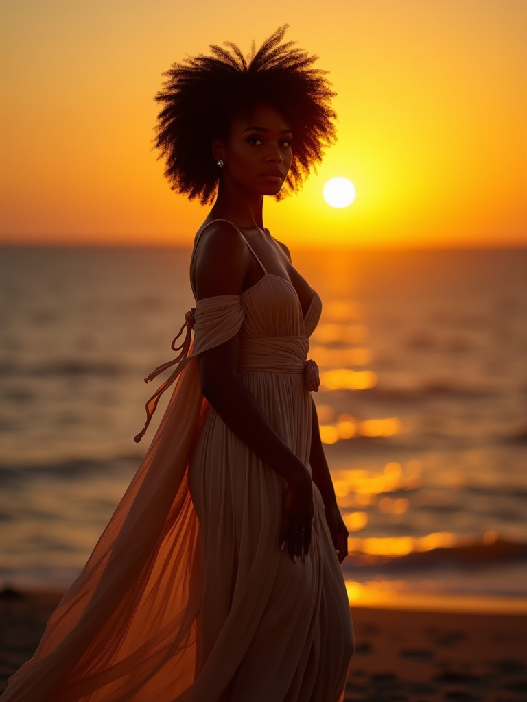 Full body golden hour portrait of model. Flowing outfit in warm light, sensual pose . Golden hour photography.