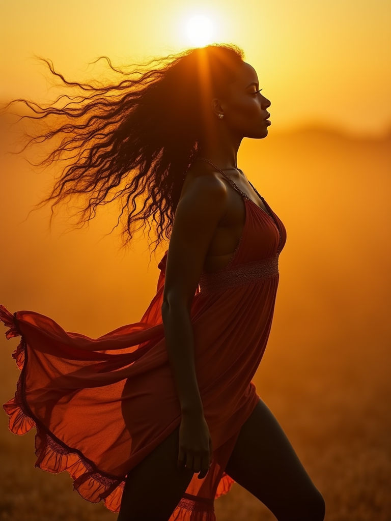 Full body golden hour portrait of model. Flowing outfit in warm light, sensual pose . Golden hour photography.