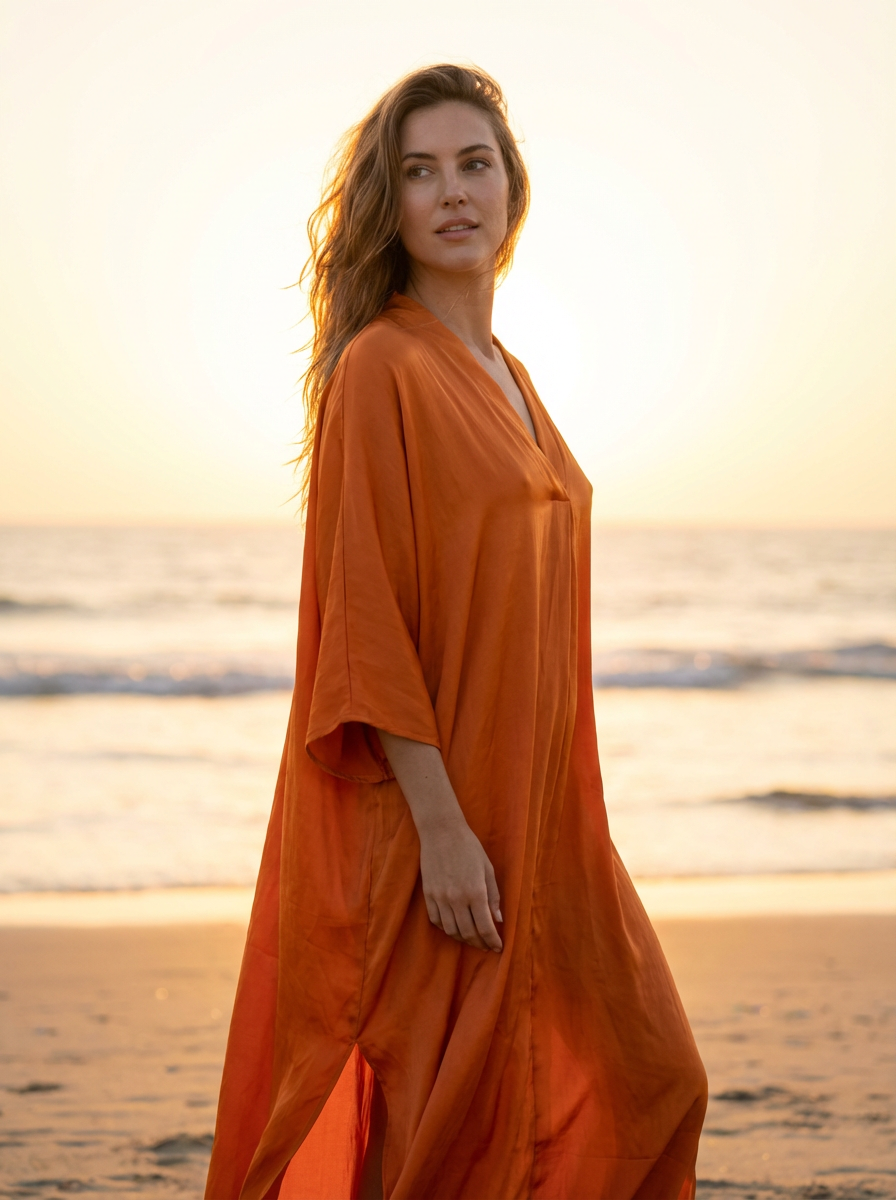 Full body golden hour portrait of model. Flowing outfit in warm light, sensual pose . Golden hour photography.