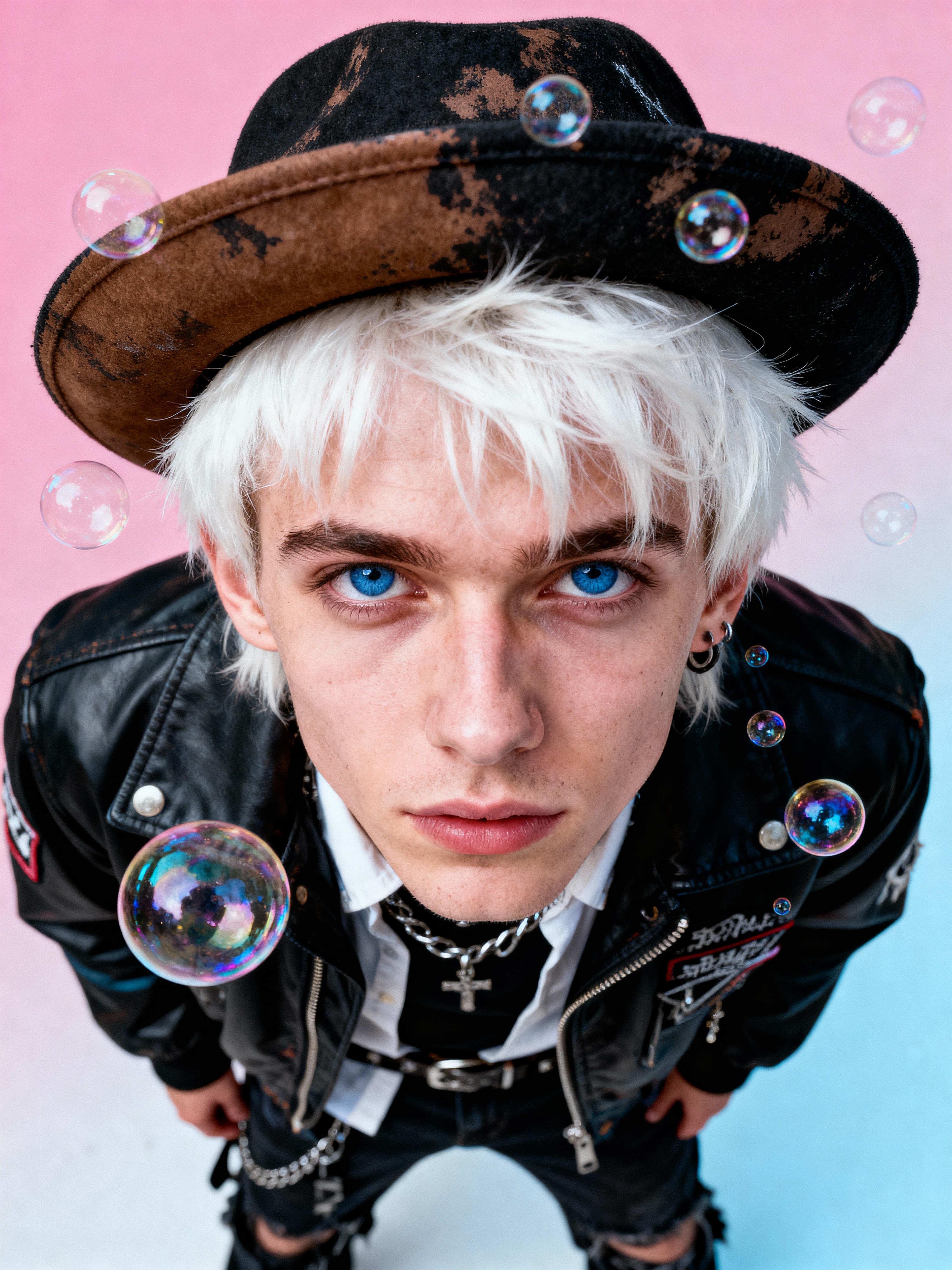full body of a street punk model student, blue eyes, bubble jacket, hat, white hair by atey ghailan, by greg rutkowski, by greg tocchini, by james gilleard, by joe fenton, by kaethe butcher, gradient pink, black, brown and light blue color scheme, grunge aesthetic