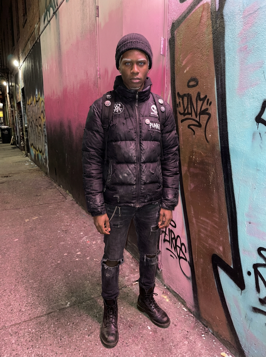 full body of a street punk model student, blue eyes, bubble jacket, hat, white hair by atey ghailan, by greg rutkowski, by greg tocchini, by james gilleard, by joe fenton, by kaethe butcher, gradient pink, black, brown and light blue color scheme, grunge aesthetic