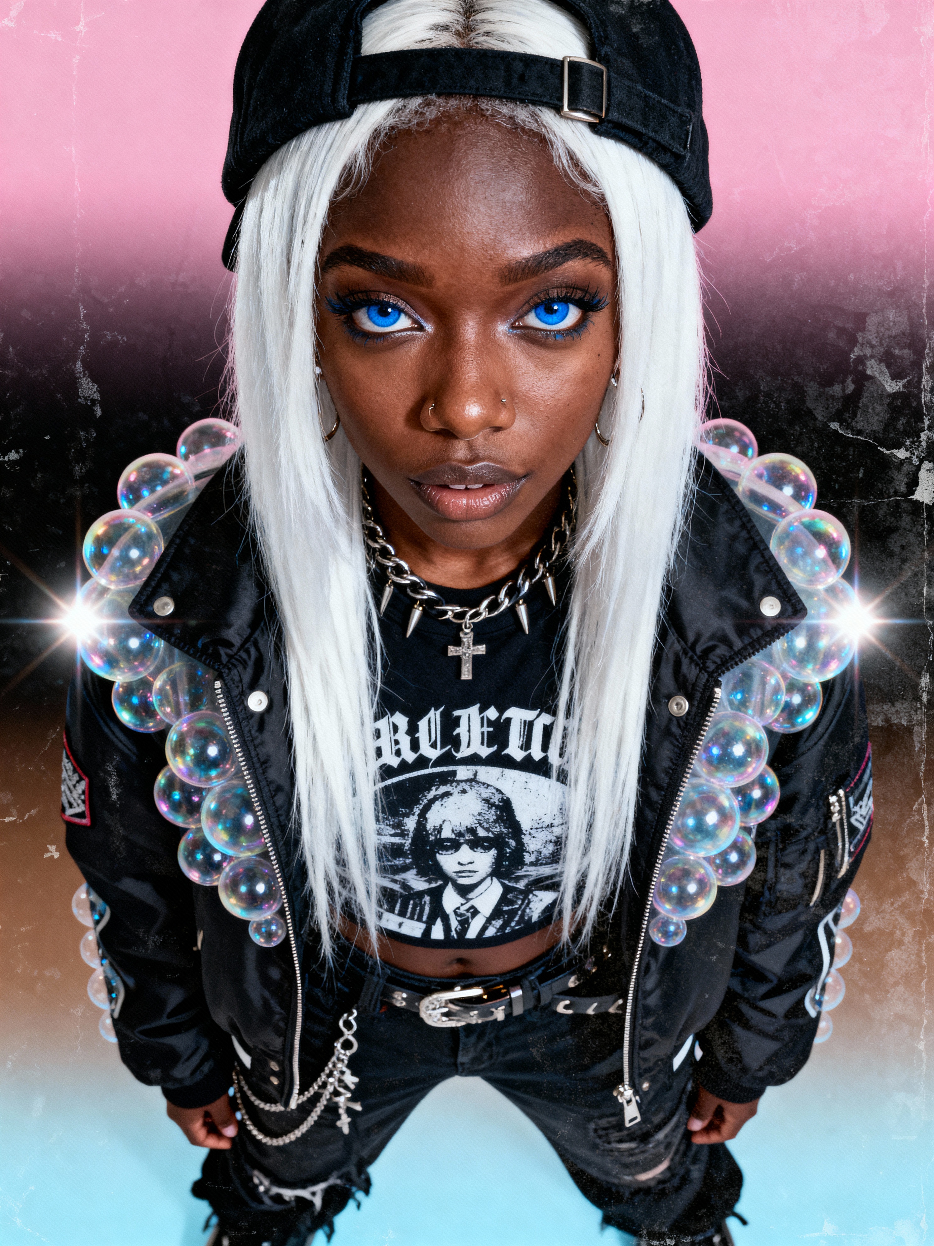 full body of a street punk model student, blue eyes, bubble jacket, hat, white hair by atey ghailan, by greg rutkowski, by greg tocchini, by james gilleard, by joe fenton, by kaethe butcher, gradient pink, black, brown and light blue color scheme, grunge aesthetic