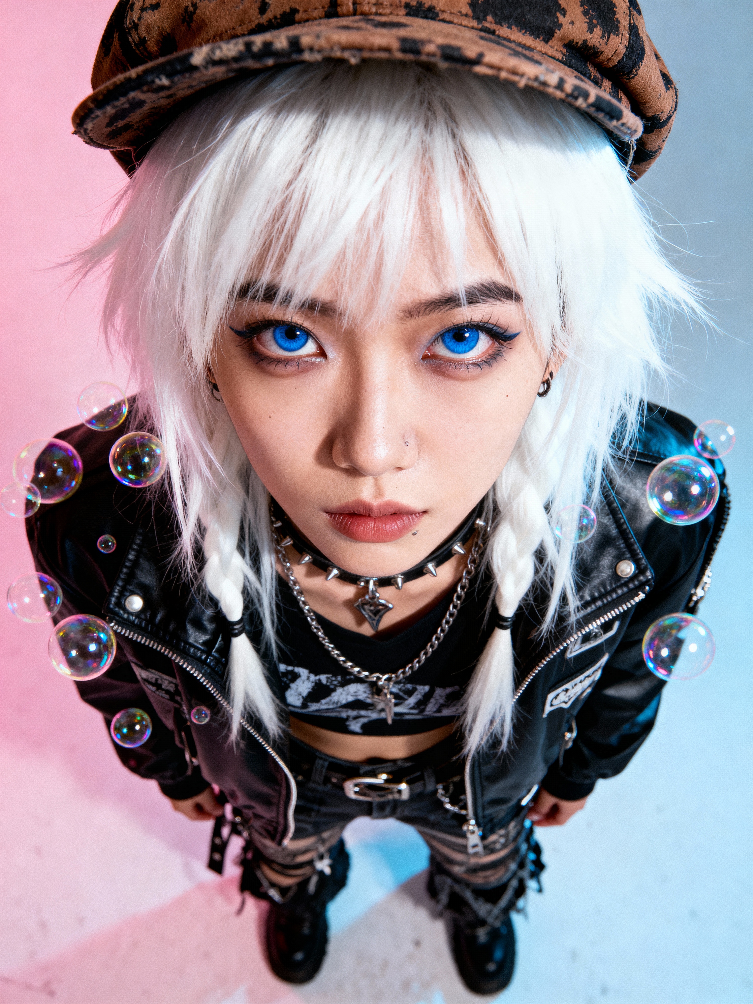 full body of a street punk model student, blue eyes, bubble jacket, hat, white hair by atey ghailan, by greg rutkowski, by greg tocchini, by james gilleard, by joe fenton, by kaethe butcher, gradient pink, black, brown and light blue color scheme, grunge aesthetic