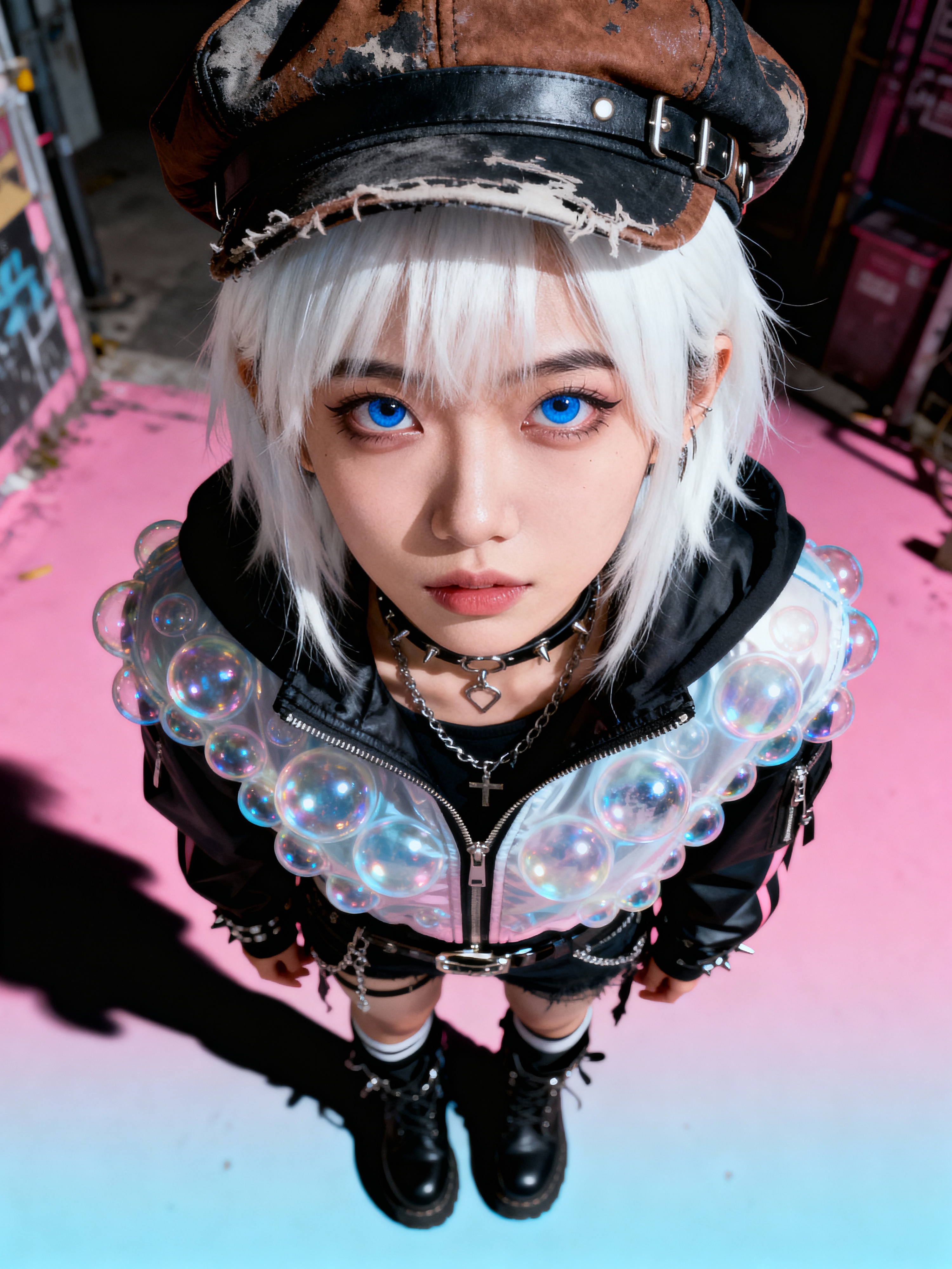 full body of a street punk model student, blue eyes, bubble jacket, hat, white hair by atey ghailan, by greg rutkowski, by greg tocchini, by james gilleard, by joe fenton, by kaethe butcher, gradient pink, black, brown and light blue color scheme, grunge aesthetic