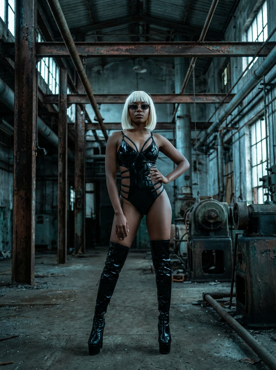full body photo of a confident model wearing an ultra-revealing black latex glossy bodysuit with high-gloss finish and strappy cutouts. she has a sleek platinum bob wig and thigh-high platform boots, standing in a gritty, industrial warehouse with exposed pipes and rusted beams. her futuristic look is bold, dominant, and robotic, evoking a high-tech femme fatale presence.