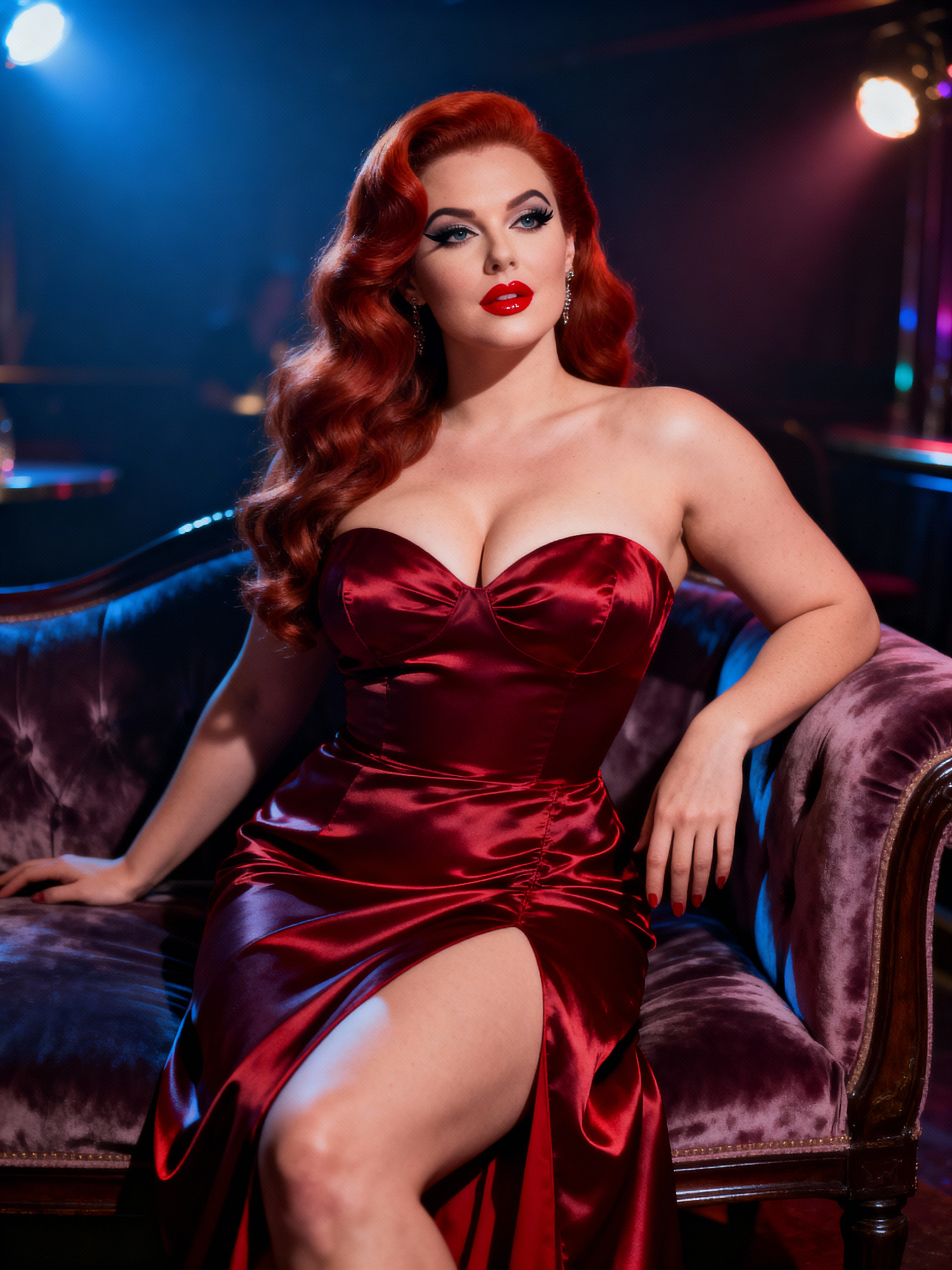 Full body photo of a curvy, busty model styled in a vintage Hollywood bombshell look — wearing a shimmering deep red strapless satin gown with a high thigh slit and sculpted sweetheart neckline. Her long, wavy red hair cascades over one eye, paired with dramatic winged eyeliner and glossy red lips. She reclines seductively on a velvet chaise under soft cinematic lighting, evoking a glamorous, sultry atmosphere straight out of a classic nightclub scene.
