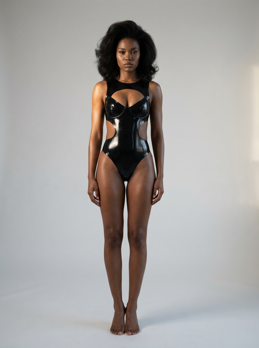 full-body photo of a model standing tall in a glossy black latex-style bodysuit with bold cutouts at the chest and waist. background is a plain background with soft directional light that highlights the shine of the outfit. hair is styled voluminously.