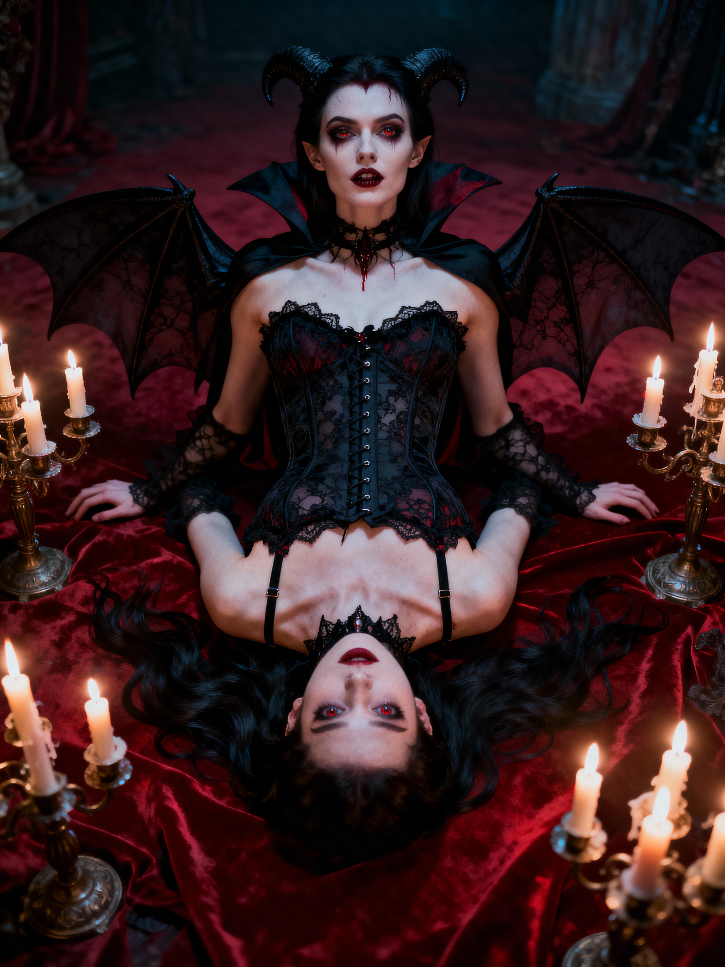 Full body photo of darkly romantic shot of model in gothic vampire-inspired black lace corset with sheer bat wings. Lying on crimson velvet surrounded by antique candelabras, her porcelain skin contrasts with the rich, blood-red tones. Flickering candlelight creates a moody, seductive glow that adds to the nocturnal, supernatural atmosphere.