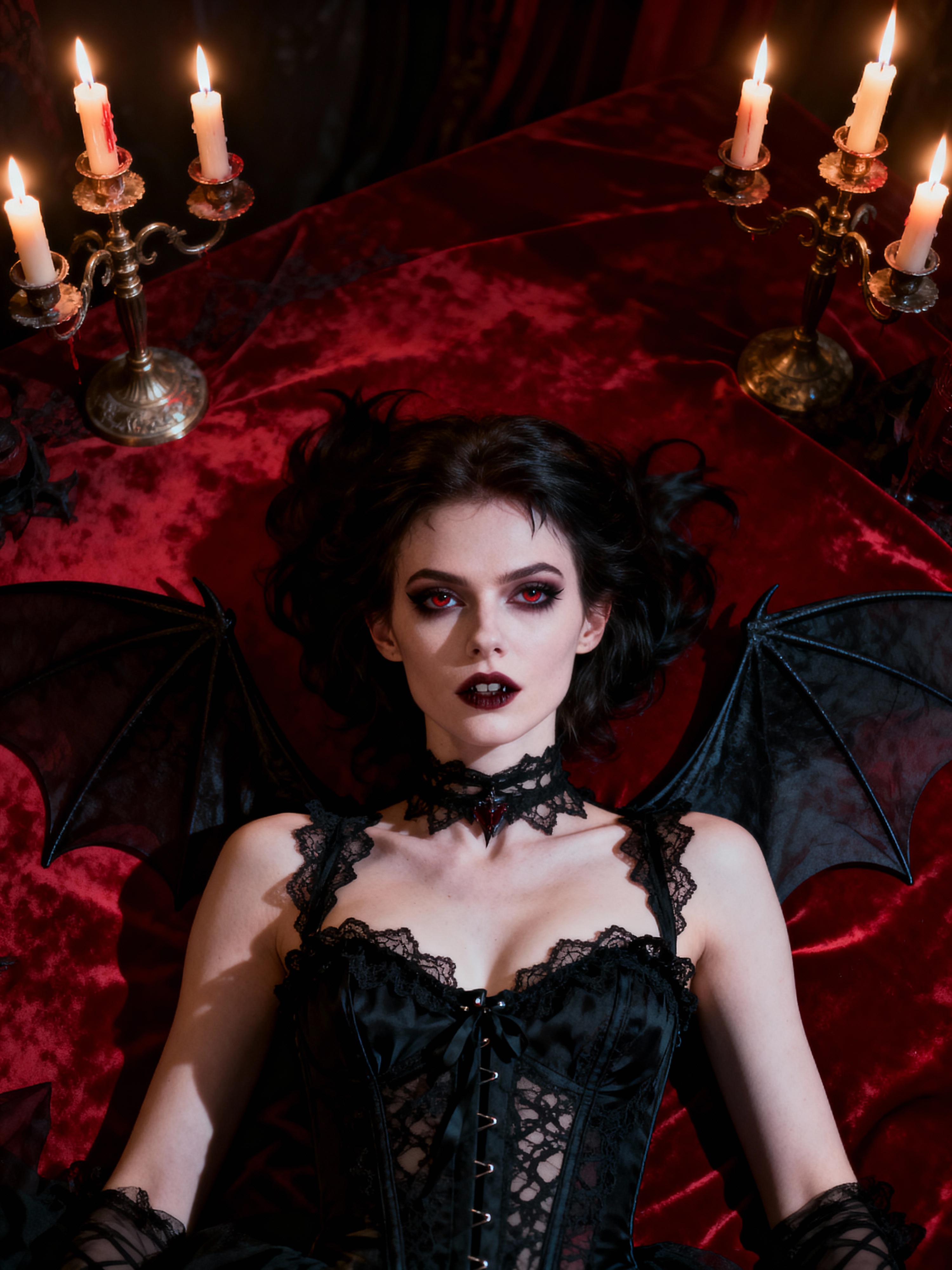 Full body photo of darkly romantic shot of model in gothic vampire-inspired black lace corset with sheer bat wings. Lying on crimson velvet surrounded by antique candelabras, her porcelain skin contrasts with the rich, blood-red tones. Flickering candlelight creates a moody, seductive glow that adds to the nocturnal, supernatural atmosphere.