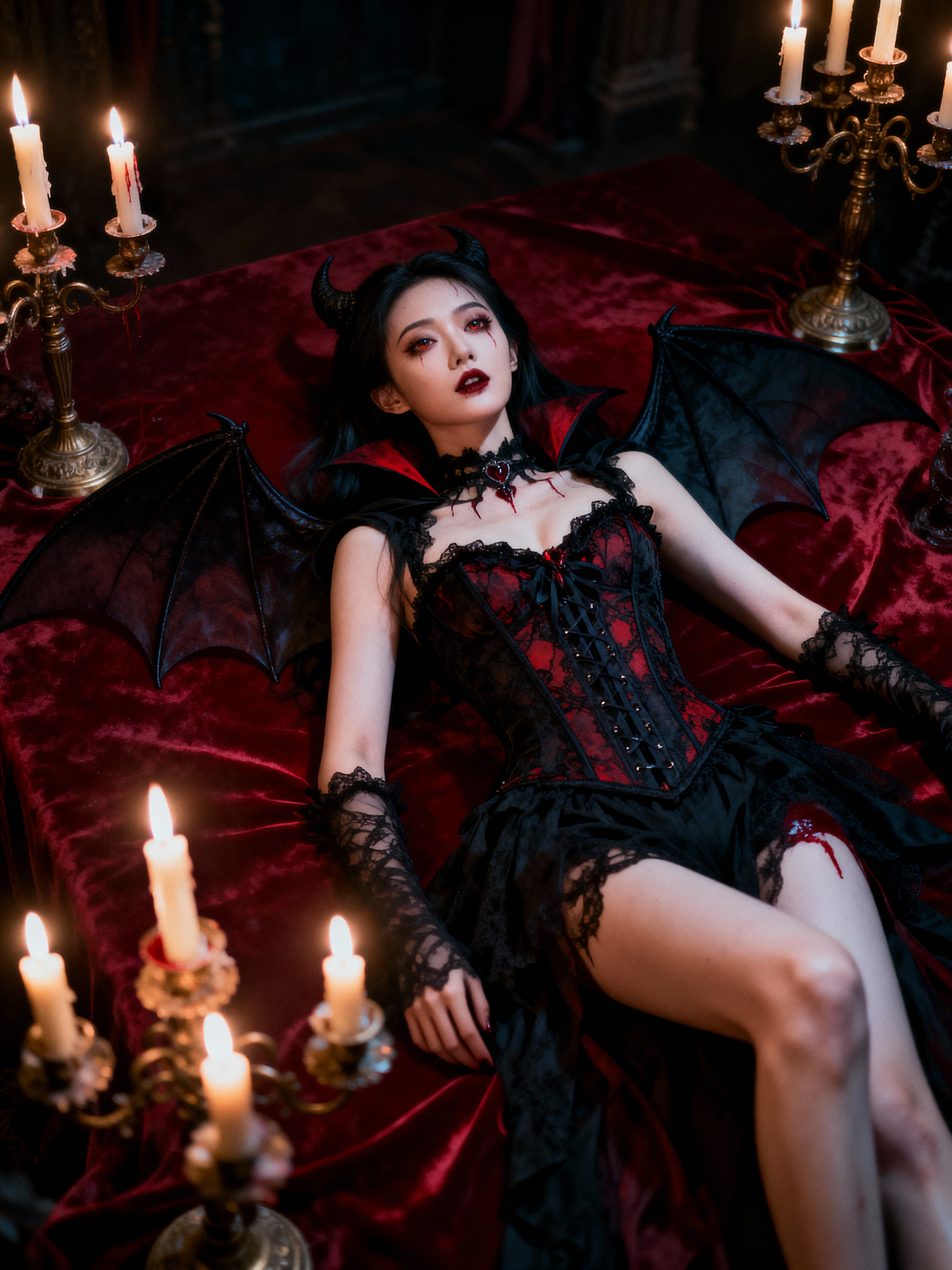Full body photo of darkly romantic shot of model in gothic vampire-inspired black lace corset with sheer bat wings. Lying on crimson velvet surrounded by antique candelabras, her porcelain skin contrasts with the rich, blood-red tones. Flickering candlelight creates a moody, seductive glow that adds to the nocturnal, supernatural atmosphere.