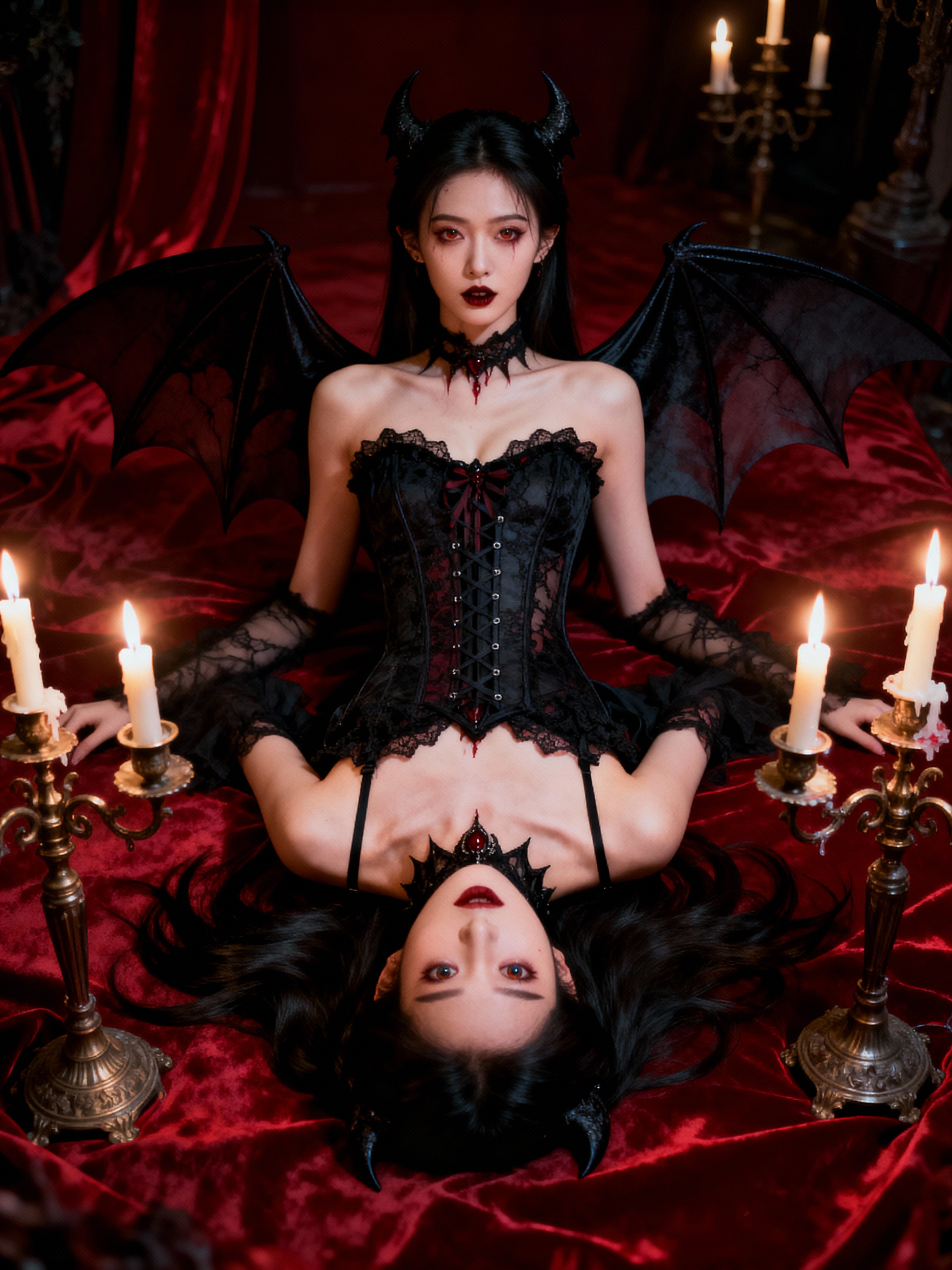 Full body photo of darkly romantic shot of model in gothic vampire-inspired black lace corset with sheer bat wings. Lying on crimson velvet surrounded by antique candelabras, her porcelain skin contrasts with the rich, blood-red tones. Flickering candlelight creates a moody, seductive glow that adds to the nocturnal, supernatural atmosphere.