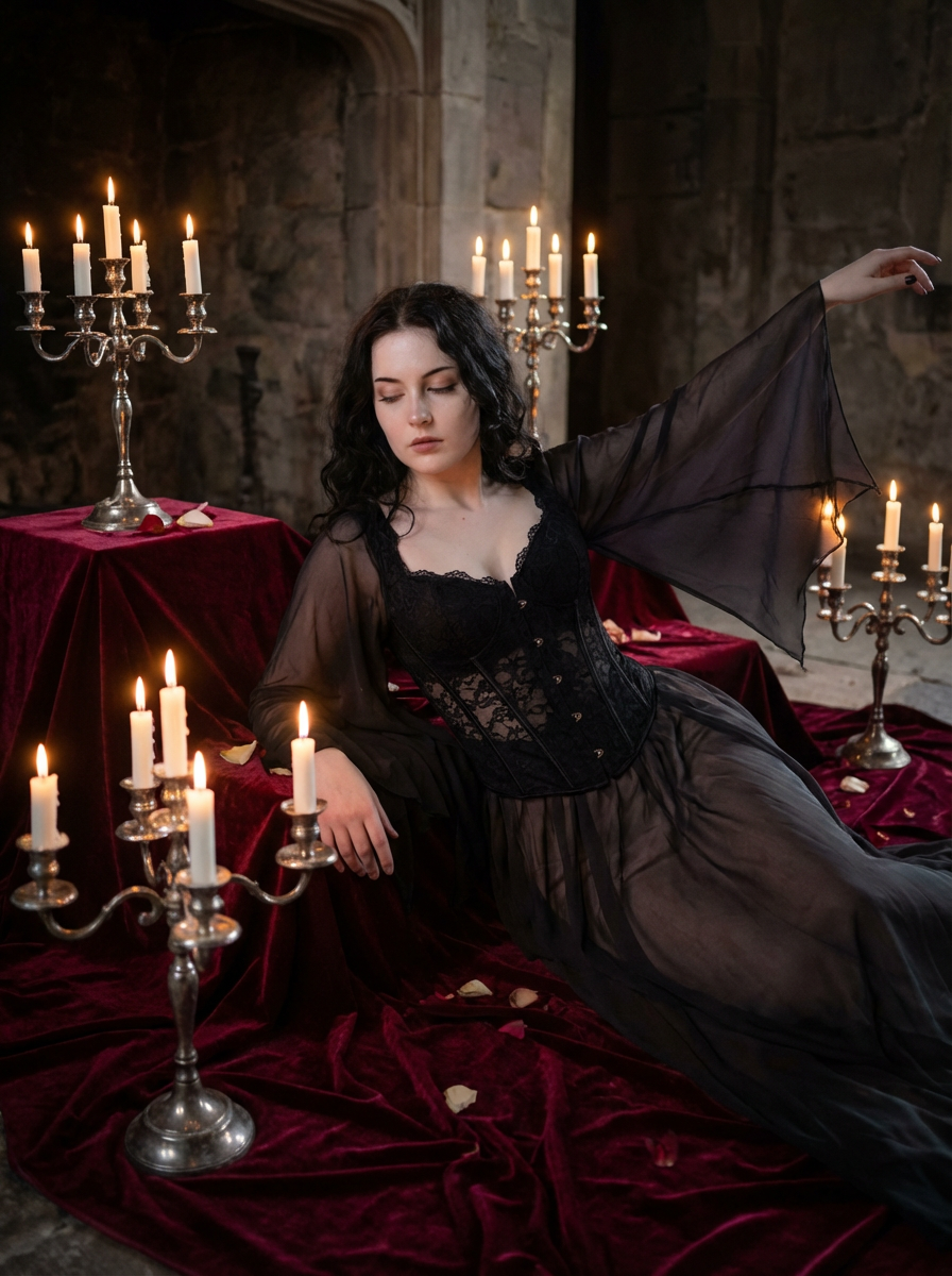 Full body photo of darkly romantic shot of model in gothic vampire-inspired black lace corset with sheer bat wings. Lying on crimson velvet surrounded by antique candelabras, her porcelain skin contrasts with the rich, blood-red tones. Flickering candlelight creates a moody, seductive glow that adds to the nocturnal, supernatural atmosphere.