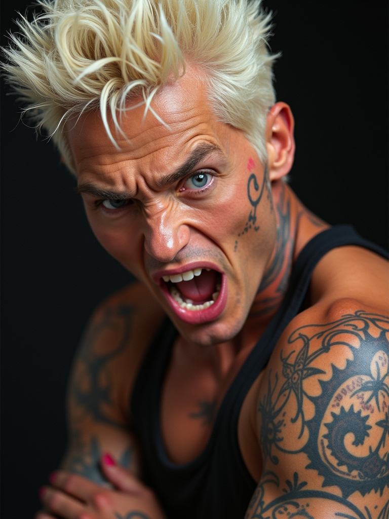 full body photo of Dramatic close-up for a 1990s album cover, intense expression. Looking fierce with platinum blonde hair and tattoos .