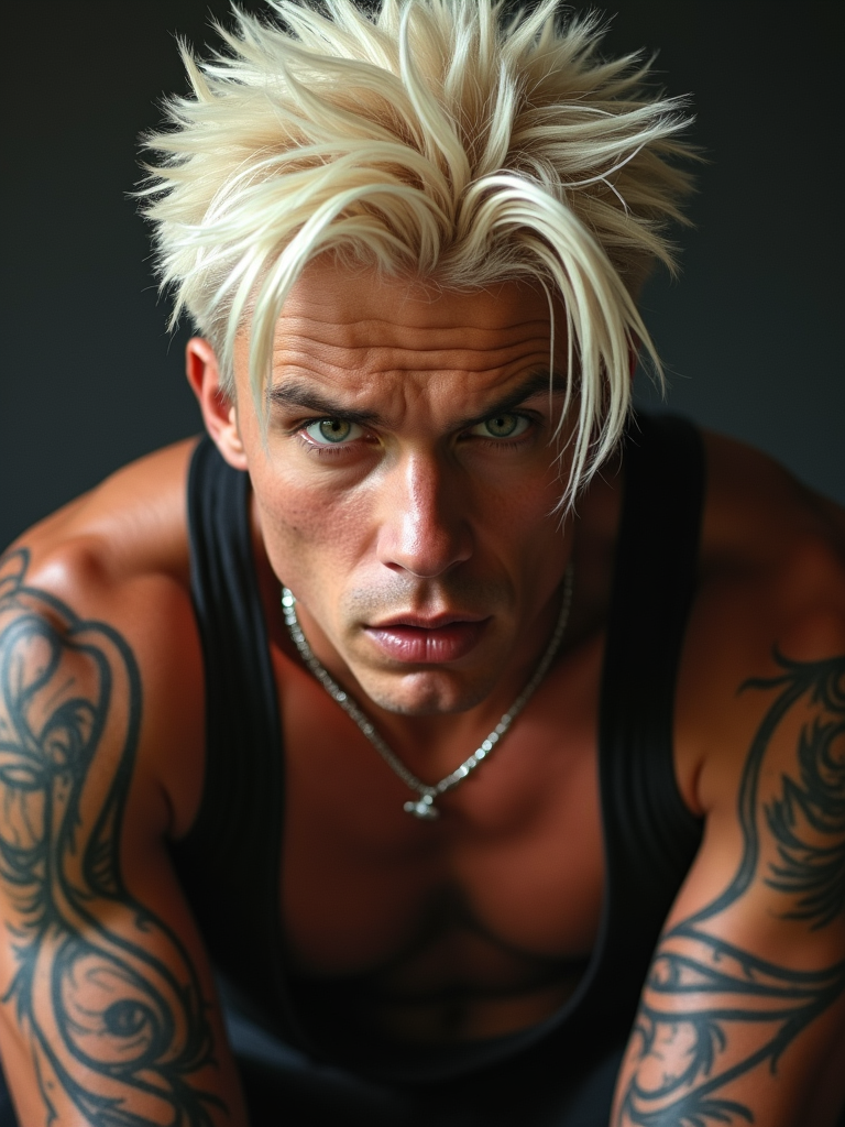 full body photo of Dramatic close-up for a 1990s album cover, intense expression. Looking fierce with platinum blonde hair and tattoos .