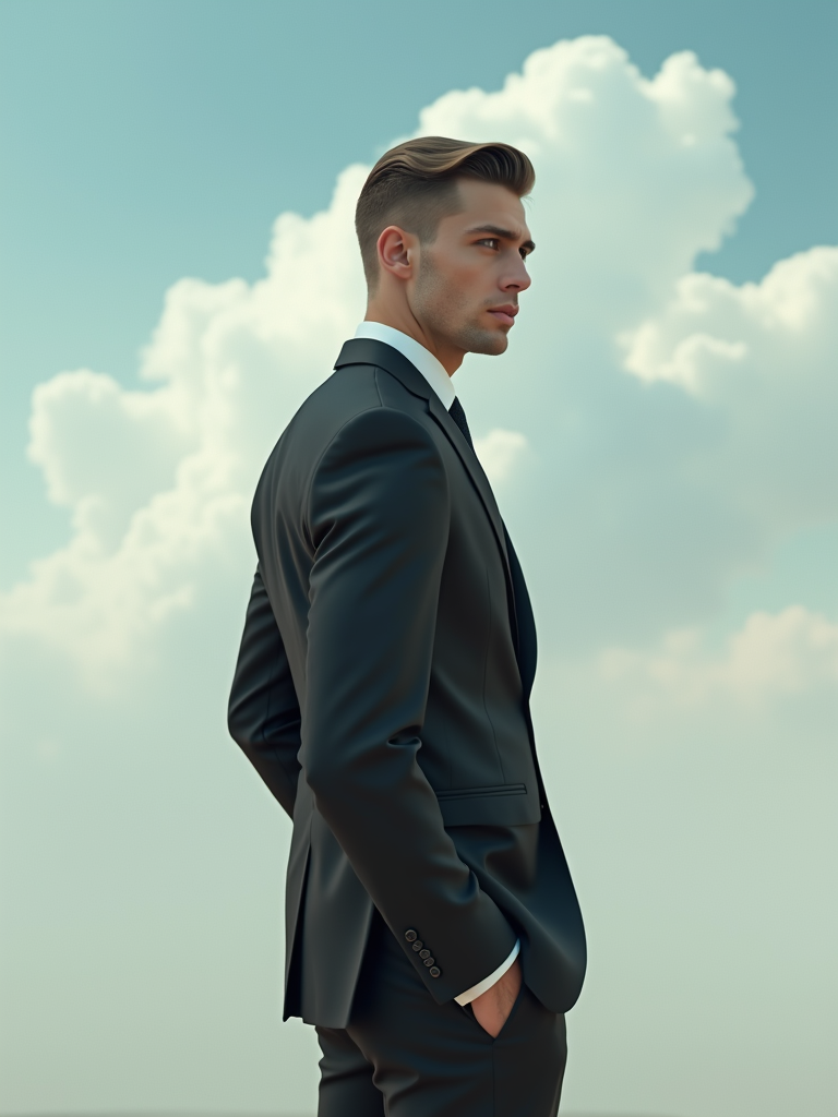 full body photo of full body photo of model posing with their back to the camera, looking over their shoulder. model is wearing a highly stylized elegant suit the background appears to be a cloudy, dreamlike sky, enhancing the surreal and artistic quality of the photograph. the lighting and composition focus attention on the contrast between her outfit and the soft background. the photo emphasizes their exaggerated, idealized body shapes.