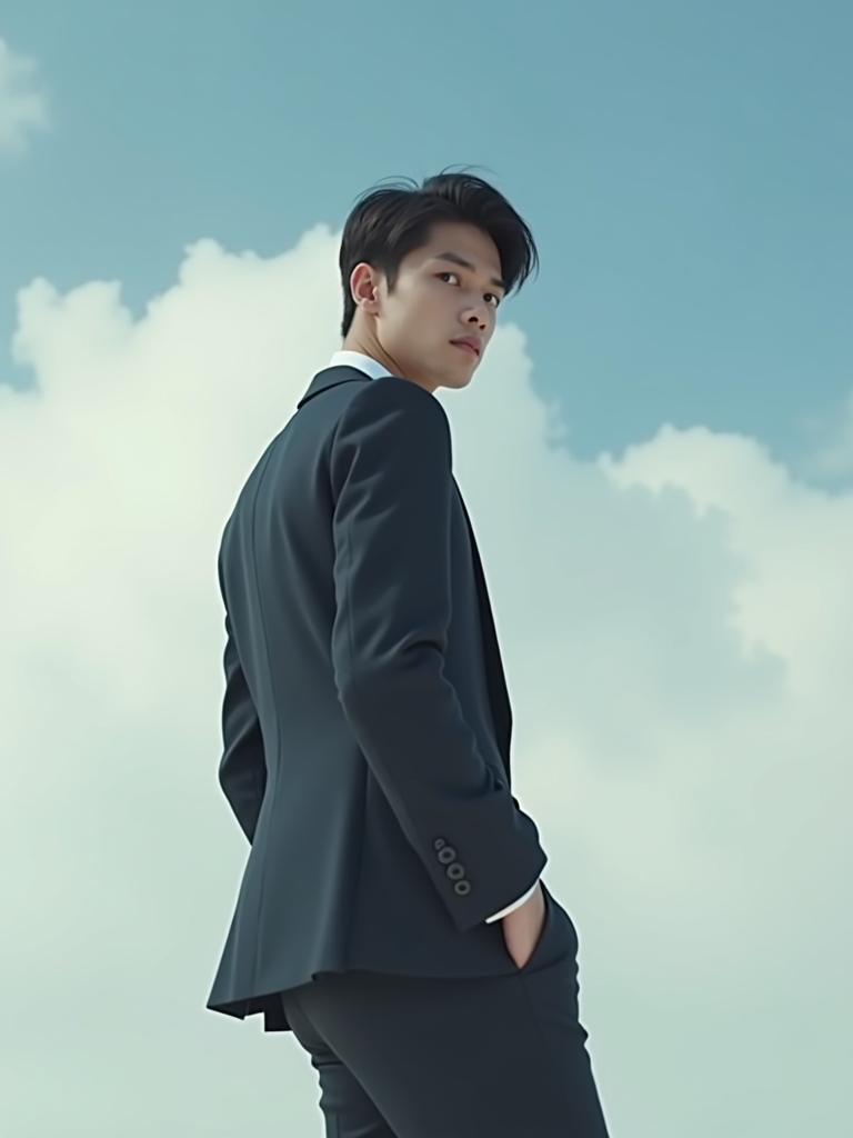 full body photo of full body photo of model posing with their back to the camera, looking over their shoulder. model is wearing a highly stylized elegant suit the background appears to be a cloudy, dreamlike sky, enhancing the surreal and artistic quality of the photograph. the lighting and composition focus attention on the contrast between her outfit and the soft background. the photo emphasizes their exaggerated, idealized body shapes.