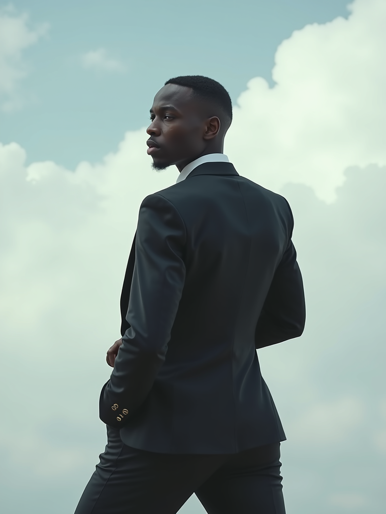 full body photo of full body photo of model posing with their back to the camera, looking over their shoulder. model is wearing a highly stylized elegant suit the background appears to be a cloudy, dreamlike sky, enhancing the surreal and artistic quality of the photograph. the lighting and composition focus attention on the contrast between her outfit and the soft background. the photo emphasizes their exaggerated, idealized body shapes.