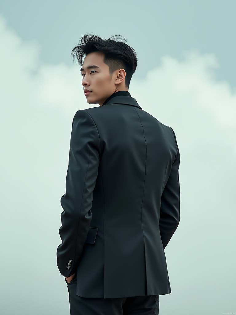 full body photo of full body photo of model posing with their back to the camera, looking over their shoulder. model is wearing a highly stylized elegant suit the background appears to be a cloudy, dreamlike sky, enhancing the surreal and artistic quality of the photograph. the lighting and composition focus attention on the contrast between her outfit and the soft background. the photo emphasizes their exaggerated, idealized body shapes.