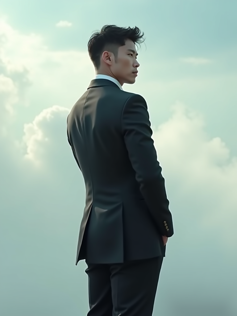 full body photo of full body photo of model posing with their back to the camera, looking over their shoulder. model is wearing a highly stylized elegant suit the background appears to be a cloudy, dreamlike sky, enhancing the surreal and artistic quality of the photograph. the lighting and composition focus attention on the contrast between her outfit and the soft background. the photo emphasizes their exaggerated, idealized body shapes.