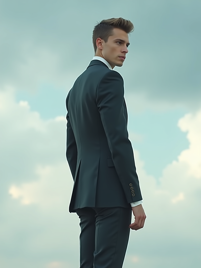 full body photo of full body photo of model posing with their back to the camera, looking over their shoulder. model is wearing a highly stylized elegant suit the background appears to be a cloudy, dreamlike sky, enhancing the surreal and artistic quality of the photograph. the lighting and composition focus attention on the contrast between her outfit and the soft background. the photo emphasizes their exaggerated, idealized body shapes.