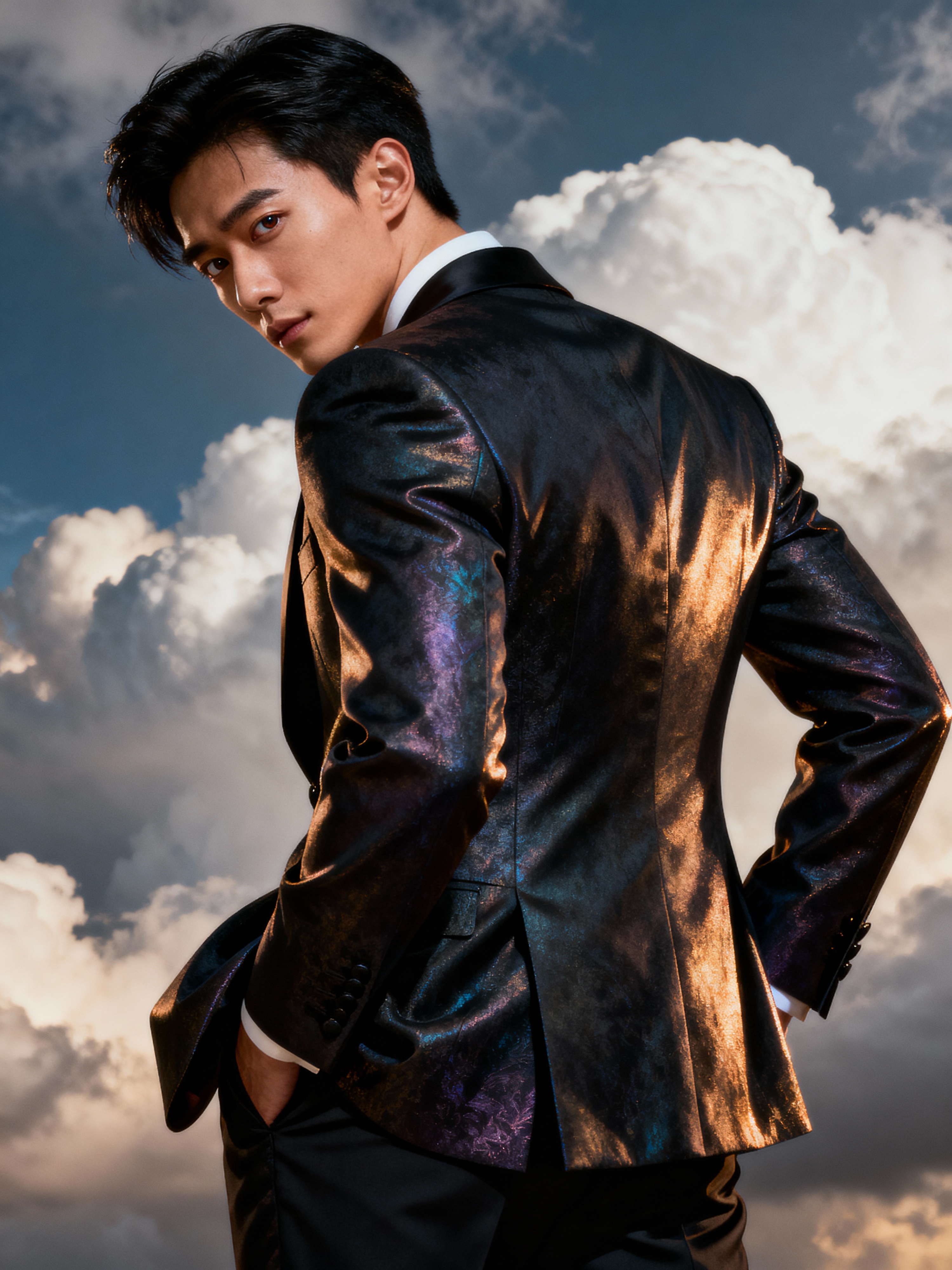 full body photo of full body photo of model posing with their back to the camera, looking over their shoulder. model is wearing a highly stylized elegant suit the background appears to be a cloudy, dreamlike sky, enhancing the surreal and artistic quality of the photograph. the lighting and composition focus attention on the contrast between her outfit and the soft background. the photo emphasizes their exaggerated, idealized body shapes.