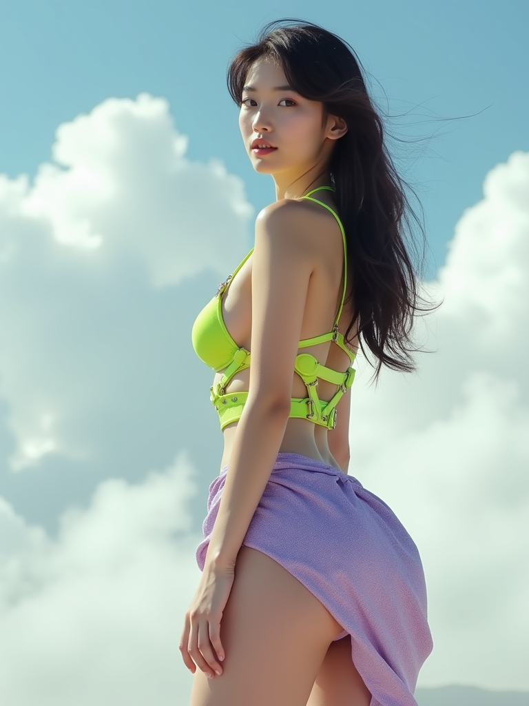 full body photo of full body photo of model posing with their back to the camera, looking over their shoulder. model is wearing a highly stylized bikini lingerie consisting of lime green harness-like straps and a lavender glittery fabric draped over her shoulders. the background appears to be a cloudy, dreamlike sky, enhancing the surreal and artistic quality of the photograph. the lighting and composition focus attention on the contrast between her outfit and the soft background. she wears high heels. the photo emphasizes their exaggerated, idealized body shapes.