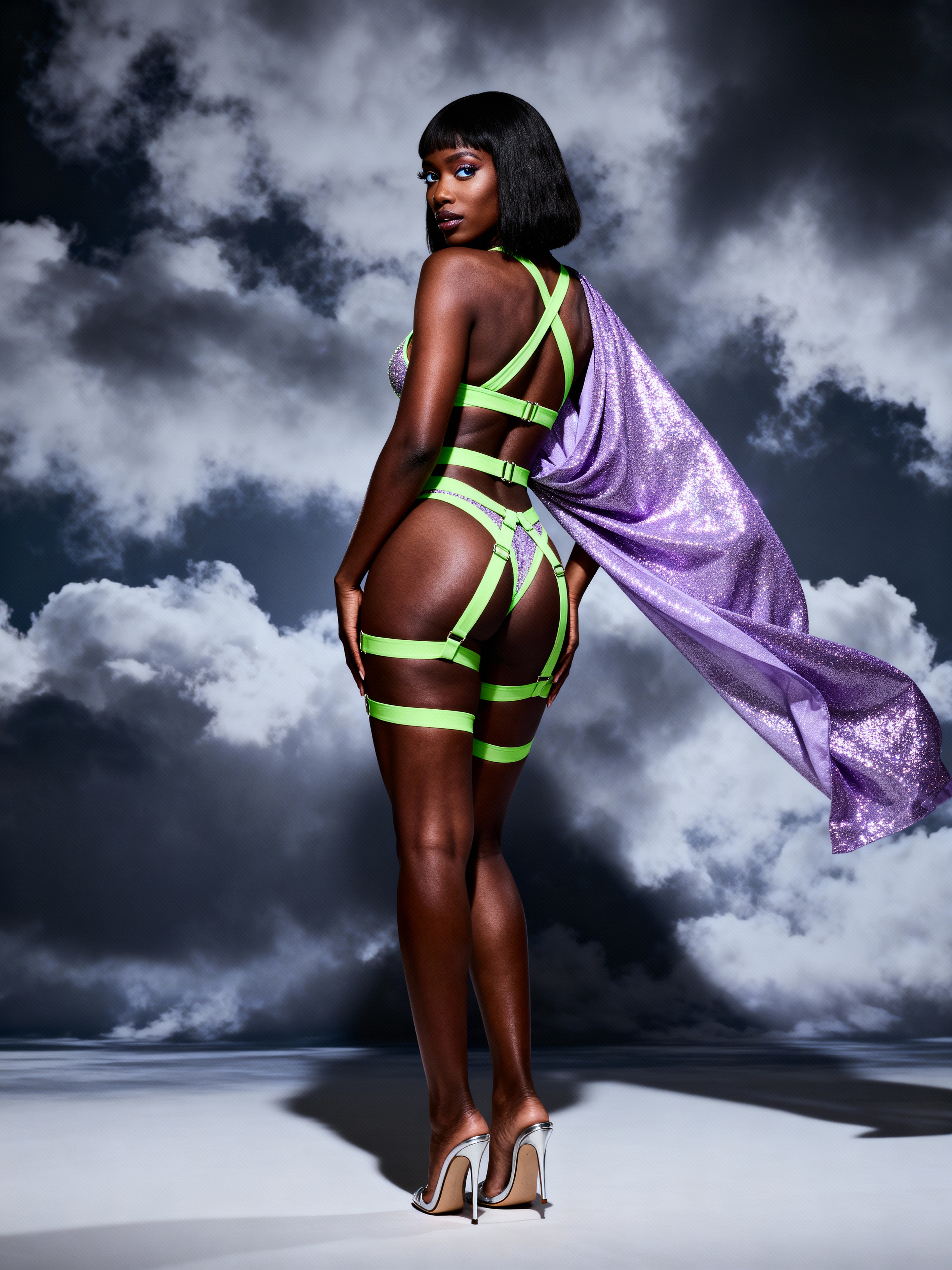 full body photo of full body photo of model posing with their back to the camera, looking over their shoulder. model is wearing a highly stylized bikini lingerie consisting of lime green harness-like straps and a lavender glittery fabric draped over her shoulders. the background appears to be a cloudy, dreamlike sky, enhancing the surreal and artistic quality of the photograph. the lighting and composition focus attention on the contrast between her outfit and the soft background. she wears high heels. the photo emphasizes their exaggerated, idealized body shapes.