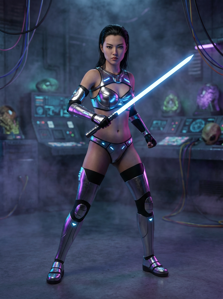 Full body photo of galactic fantasy scene of model in metallic glossy silver and black space-themed lingerie, holding a glowing glowing sci-fi energy sword. She poses in a smoky, dimly lit room filled with sci-fi props and glowing tech elements. Her confident warrior stance and sharp expression give her an interstellar dominatrix vibe.