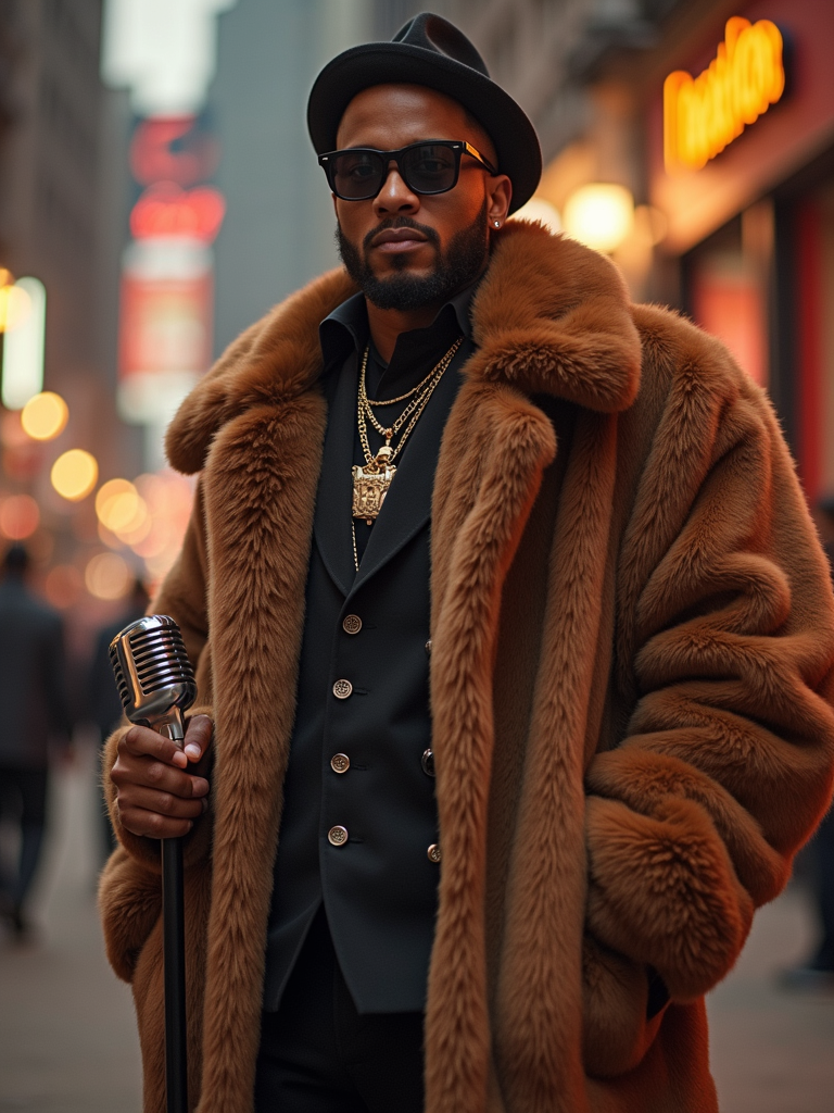 full body photo of High-energy street 1990s rap photoshoot. Luxury fur coat, bold attitude, holding a mic . Classic 90s hip-hop vibes.