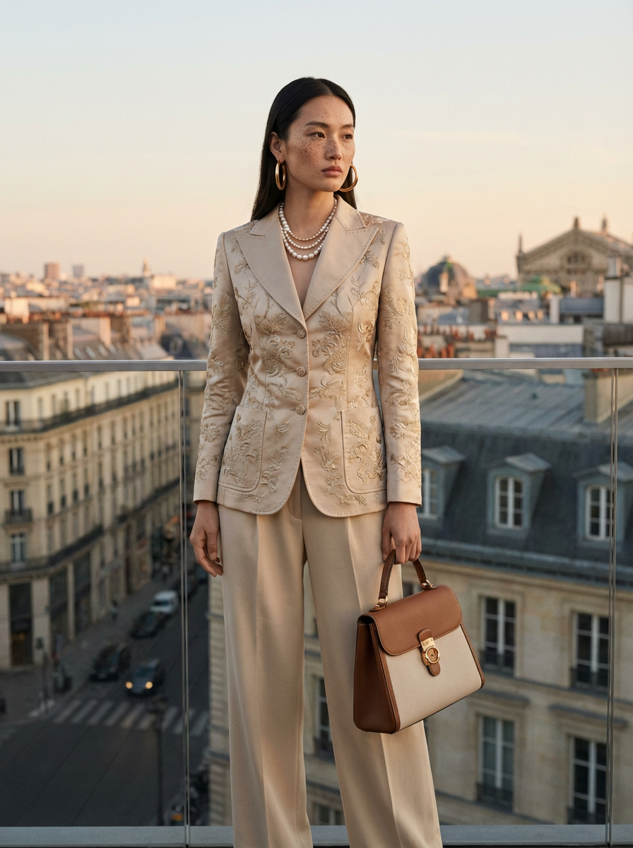 full body photo of insanely beautiful model with freckles in a luxury brand campaign. Wearing high-end accessories, sophisticated pose . Upscale environment, luxury photography.