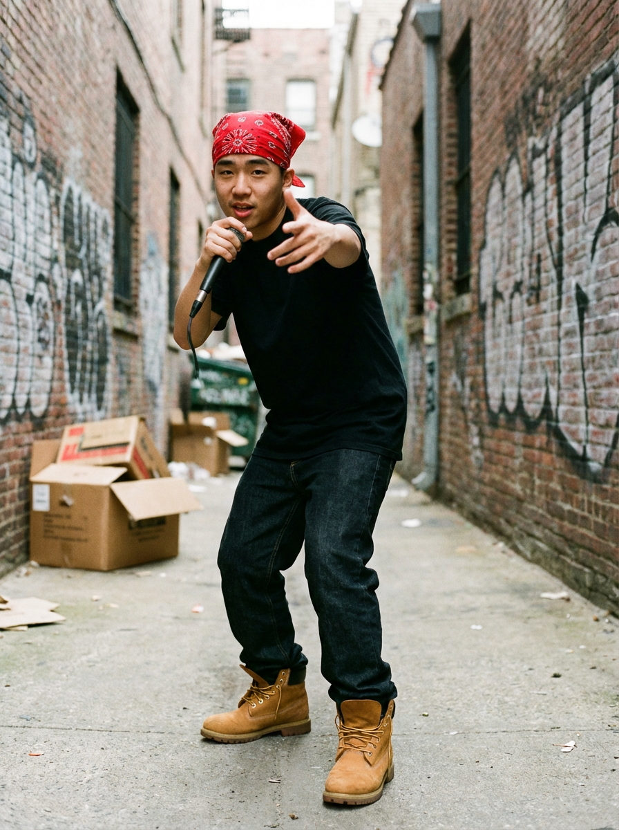 full body photo of model in a high-energy street 1990s rap photoshoot. Timberlands, bandana, rap star energy. Classic 90s hip-hop vibes.