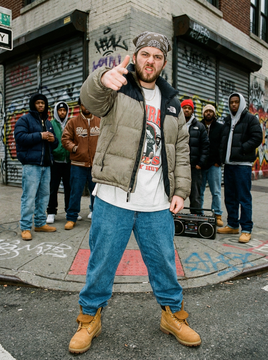 full body photo of model in a high-energy street 1990s rap photoshoot. Timberlands, bandana, rap star energy. Classic 90s hip-hop vibes.