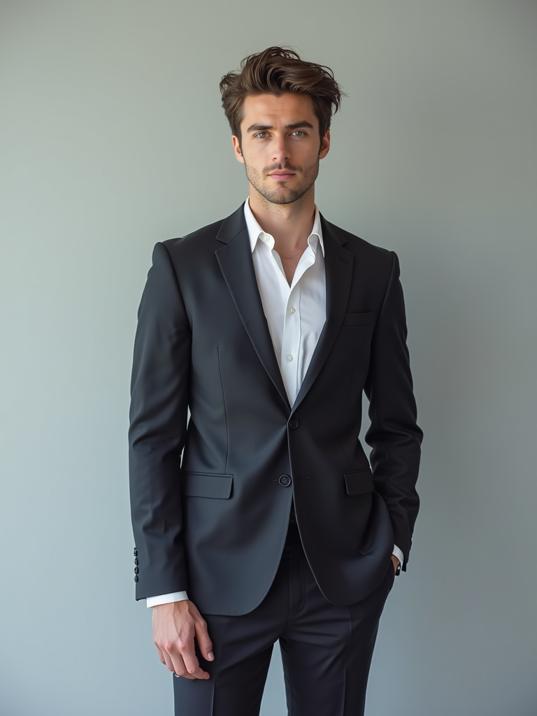 full body photo of model is looking directly at the camera and has styled her hair with volume and a slight wave. Wearing a elegeant suit The background is a plain, light gray color, creating a minimalist setting.