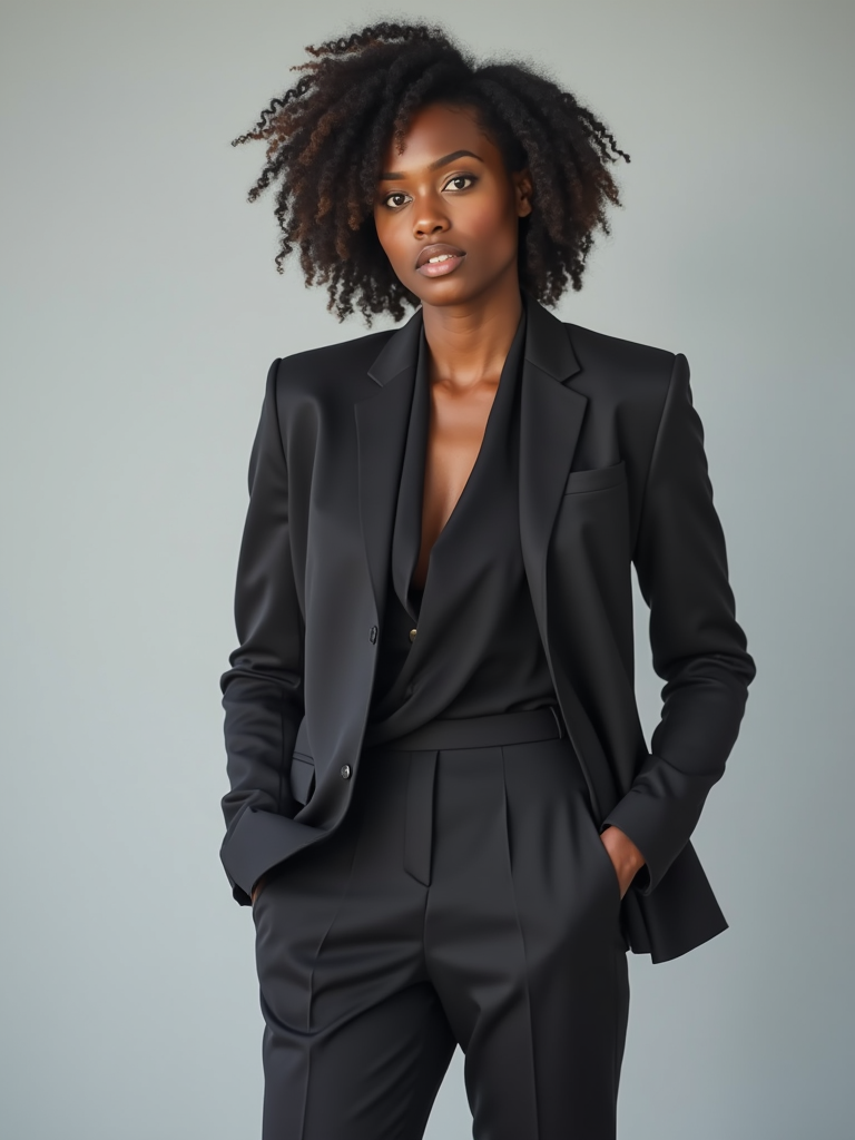 full body photo of model is looking directly at the camera and has styled her hair with volume and a slight wave. Wearing a elegeant suit The background is a plain, light gray color, creating a minimalist setting.