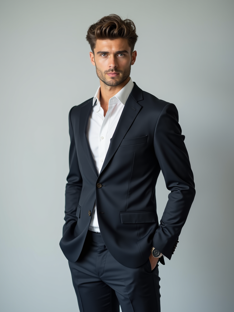 full body photo of model is looking directly at the camera and has styled her hair with volume and a slight wave. Wearing a elegeant suit The background is a plain, light gray color, creating a minimalist setting.